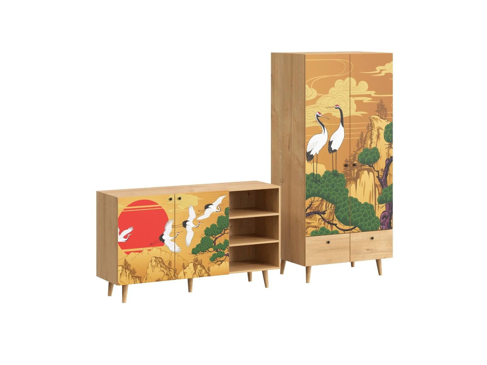 Корпусная мебель, с которой можно составить множество решений для гостиной, детской, кухни, спальни, прихожей, рабочей зоны. Комоды, шкафы, тумбы, столы, витрины, полки, серванты характеризуются универсальностью, многозадачностью, надёжными устойчивыми конструкциями. Имеют выразительный внешний вид, вдохновленный направлением ретро. Смотрятся легко и воздушно за счет деревянных ножек, минимального количества декоративных элементов, спокойных природных оттенков.