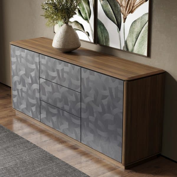 Модель буфета может похвастаться деревянными фасадами и столешницей из натурального шпона ореха со скругленными углами.