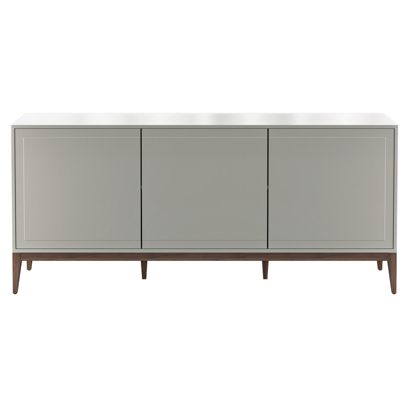 Широкий буфет на высоких ножках, с тремя дверцами из коллекции Marbella от испанского бренда MOD Interiors. Дизайнерская фрезеровка фасадов в лаконичном стиле и две дополнительные ножки по центру для увеличения устойчивости конструкции.