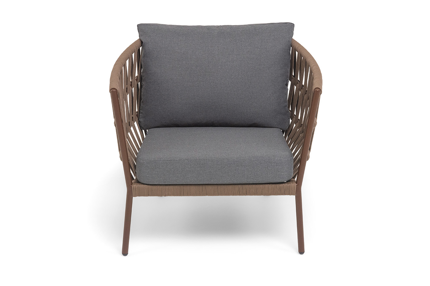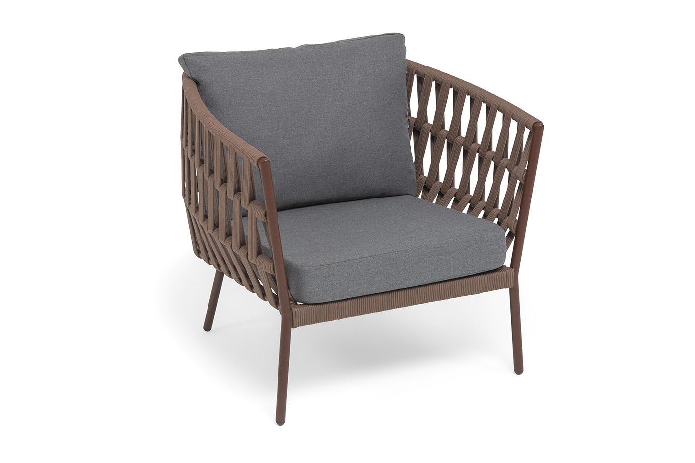 «Диего» кресло плетеное из роупа, каркас алюминий коричневый (RAL8016) муар, роуп коричневый круглый, ткань темно-серая 027