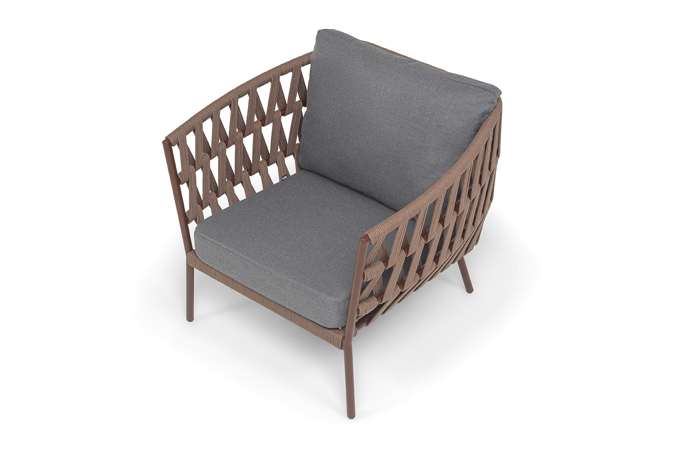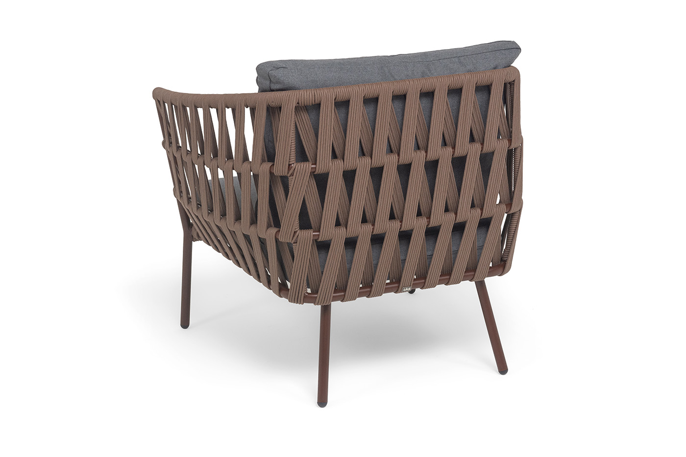 Кресло имеет алюминиевый каркас, окрашенный порошковой краской в коричневый (RAL8016) цвет. Боковины каркаса вручную оплетены роупом — эластичными синтетическими лентами, изготовленными из высокопрочных полиэфирных волокон. Цвет оплетки — коричневый.