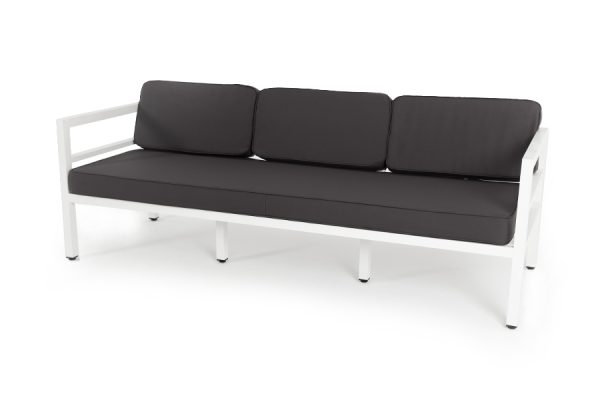 Трехместный диван «Эстелья». Каркас из алюминия, окрашенный в белый цвет, мягкие подушки на сидениях и спинках со съемными чехлами цвета «мокрый асфальт».