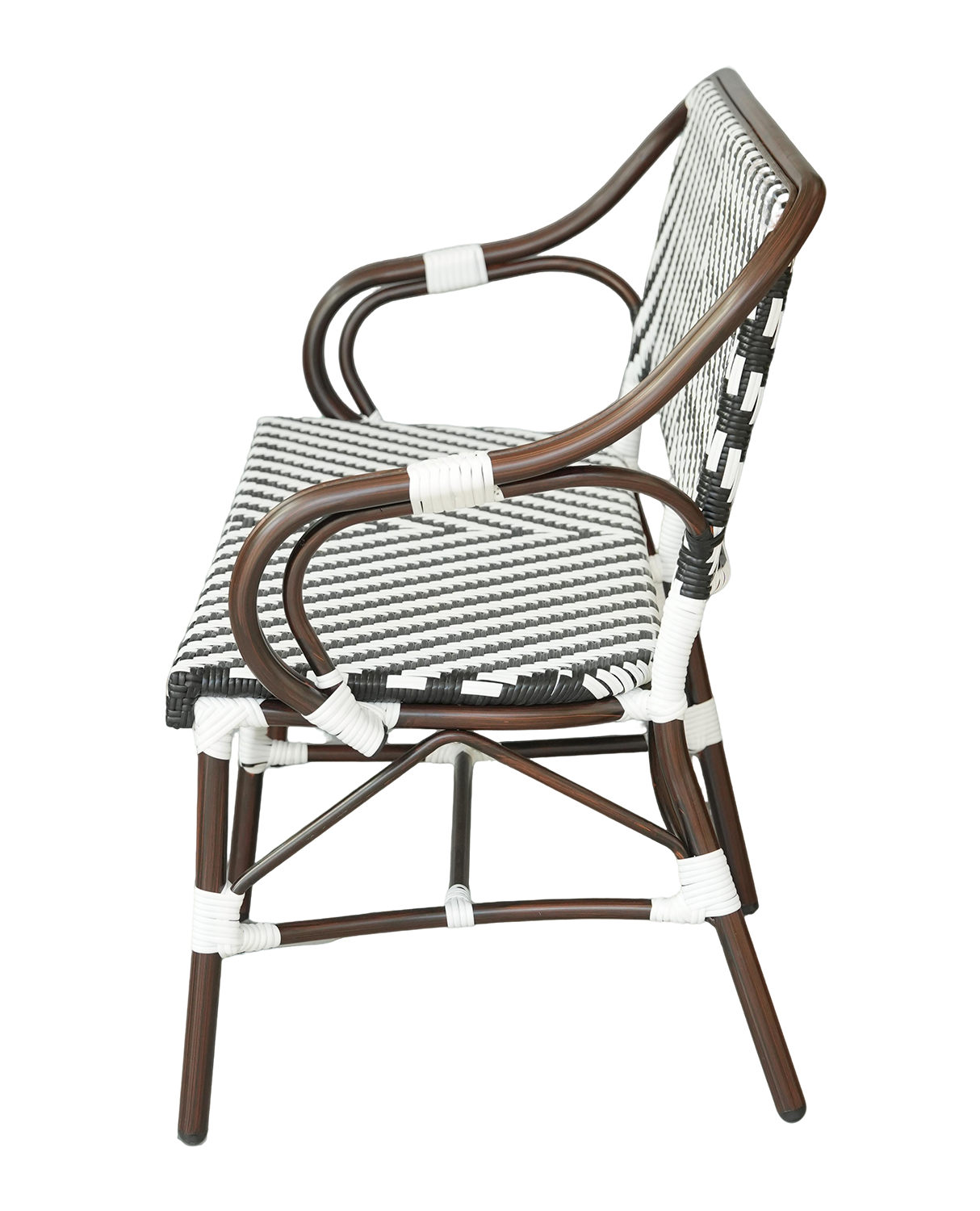 Плетение выполнено вручную из плоского искусственного ротанга 12×1,3 мм. Цвет оплетки — черно-белый.