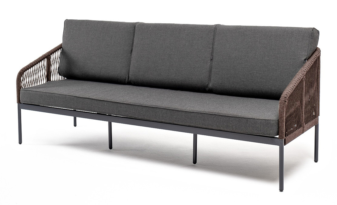 «Канны» диван 3-местный плетеный из роупа, каркас алюминий темно-серый (RAL7024) муар, роуп коричневый круглый, ткань темно-серая 027