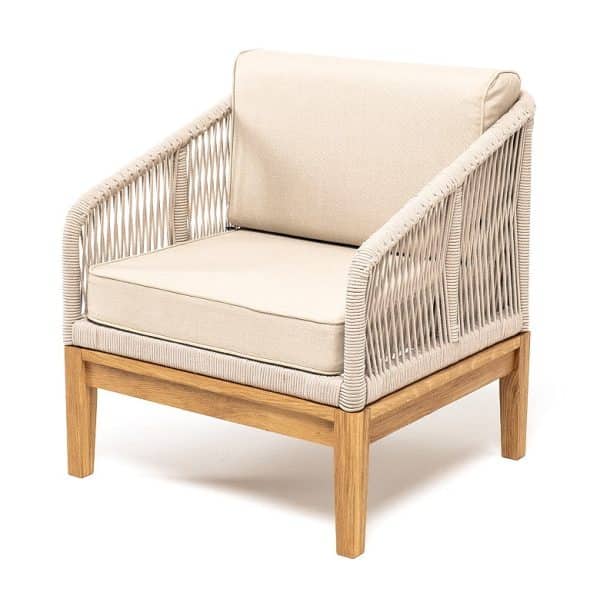 «Канны» кресло плетеное из роупа, основание дуб, роуп бежевый круглый, ткань бежевая 052