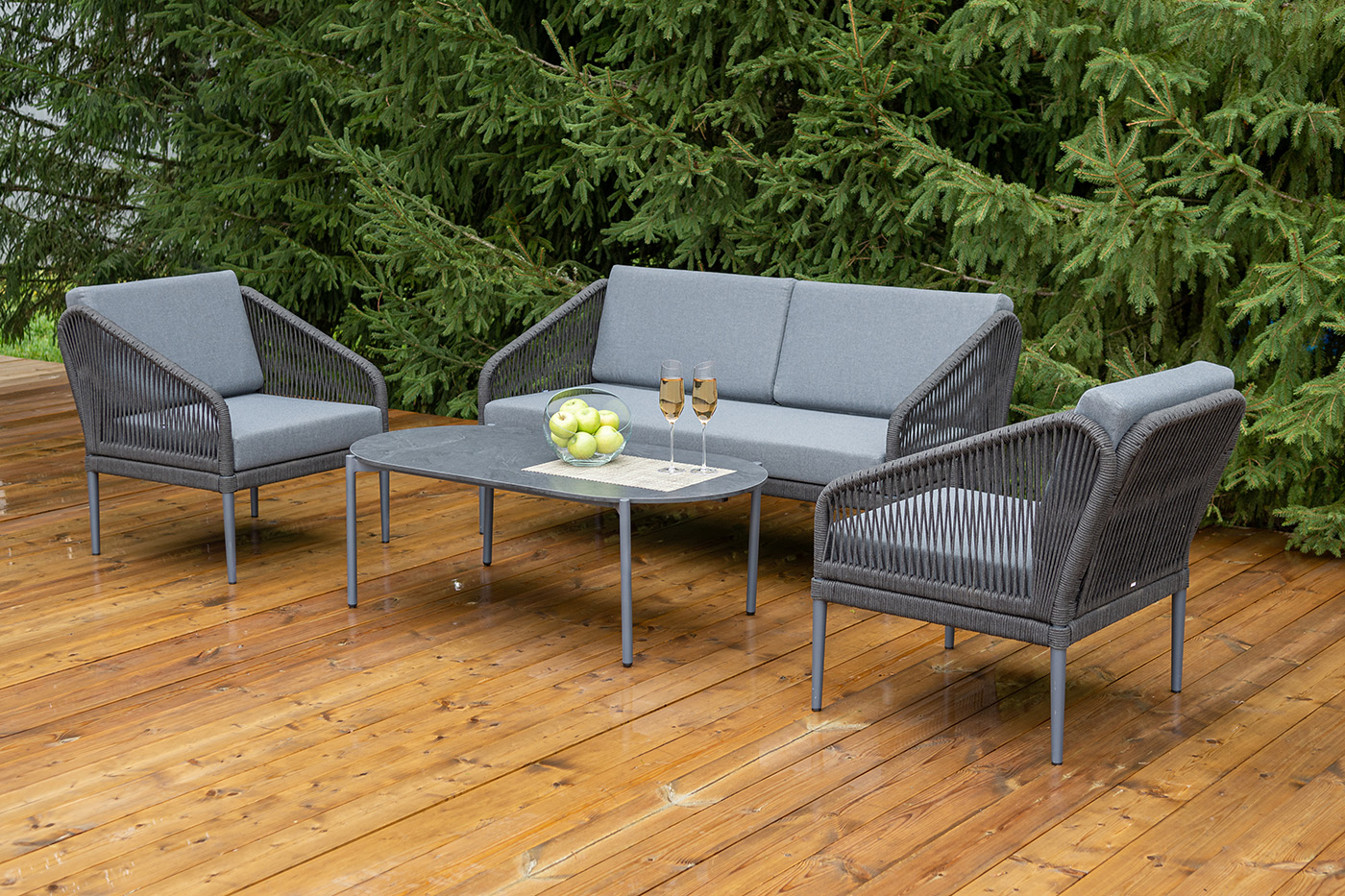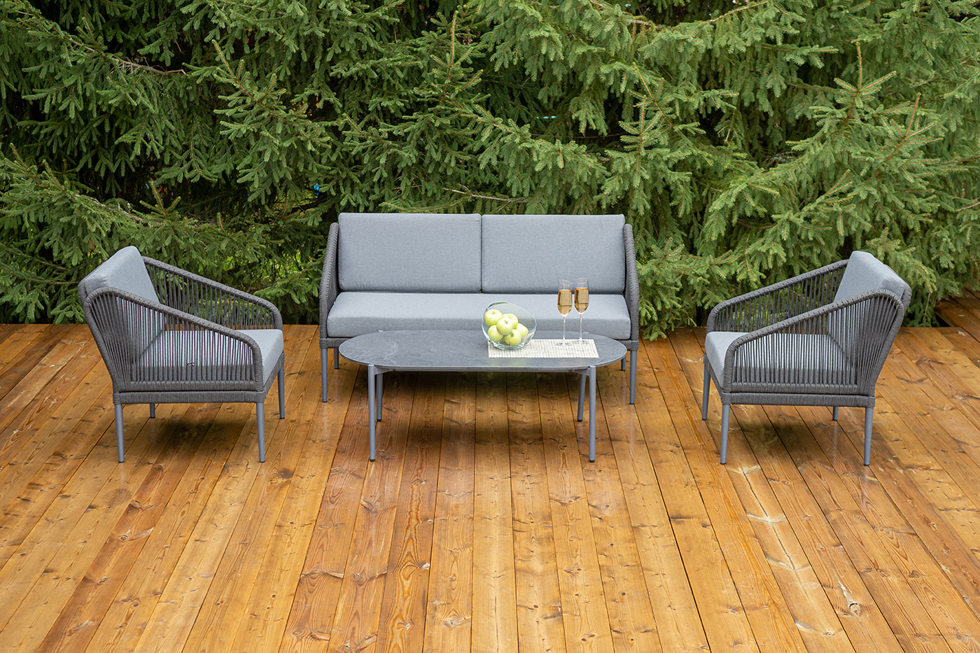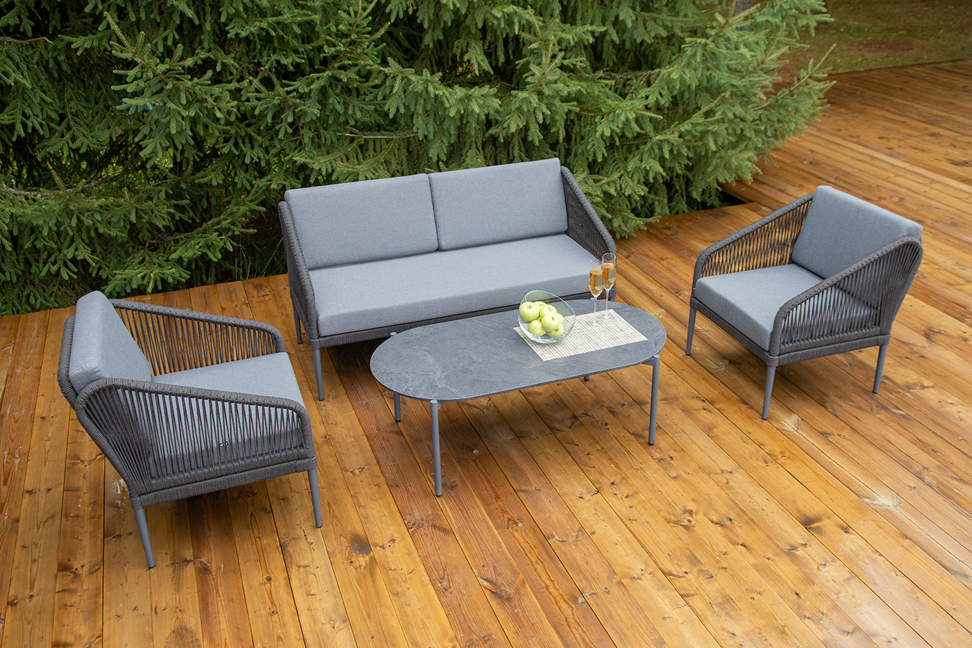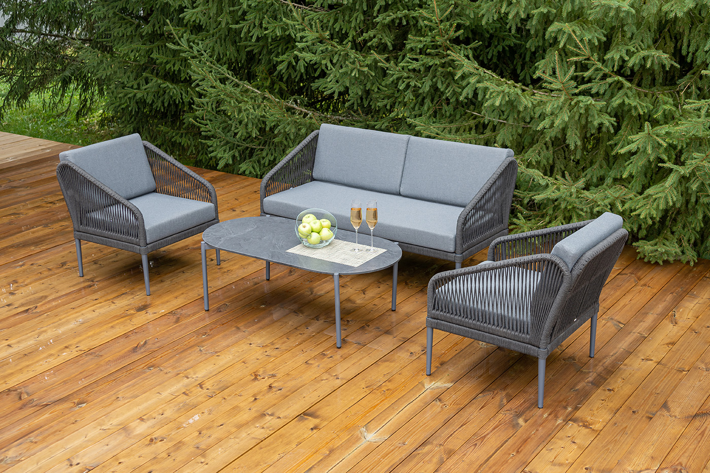 Каркас мебели изготовлен из алюминия, а боковины кресел и дивана оплетены темно‑серыми синтетическими лентами из высокопрочных полиэфирных волокон.