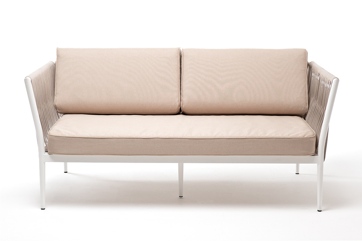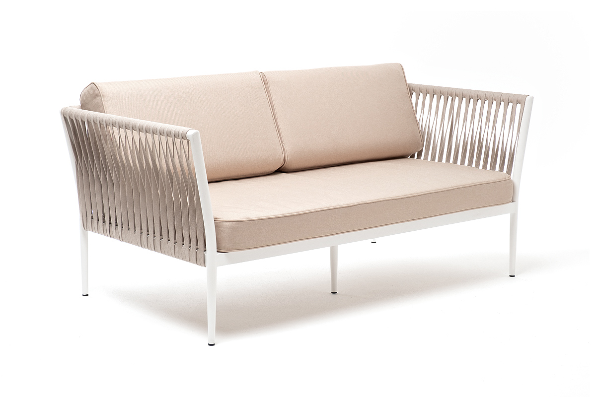 «Касабланка» диван 2-местный плетеный из роупа, каркас алюминий светло-серый (RAL7035) муар, роуп серо-коричневый 23мм, ткань бежевая 15052