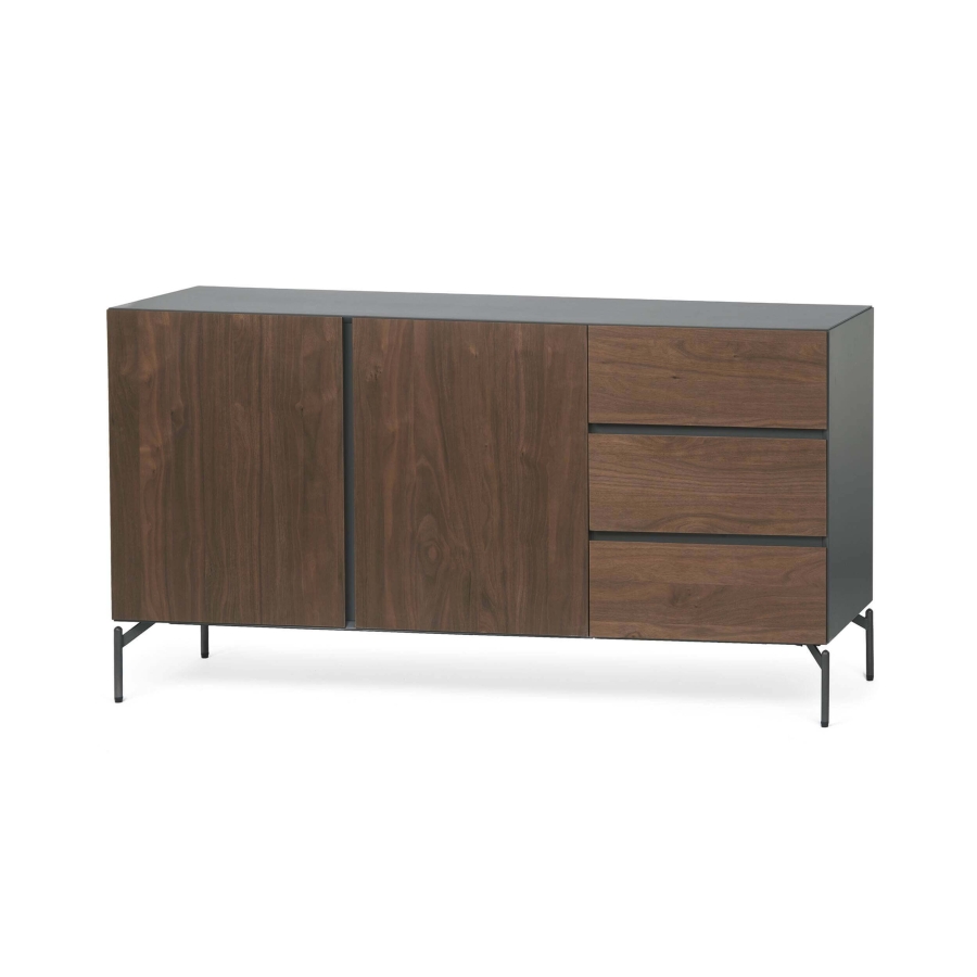 Матовый серый каркас создает приглушенный фон для дверей из ореха, добавляя нотку природного тепла и визуального интереса. Гладкие ножки создают заземленный контраст, придавая изделию оттенок индустриального шика.