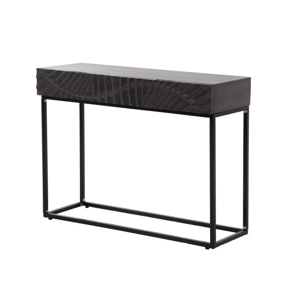 — стол консольный с двумя выдвижными ящиками — приятный платиновый оттенок — на фасад нанесен рельефный узор — отделка выполнена с сохранением естественной структуры древесины манго — установлен на металлическое основание |