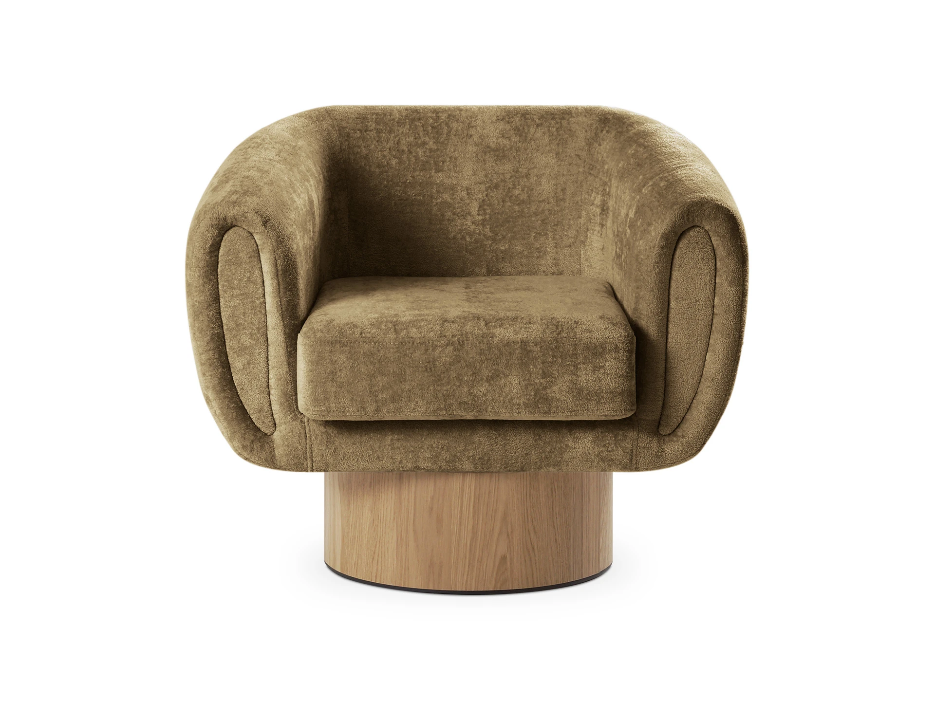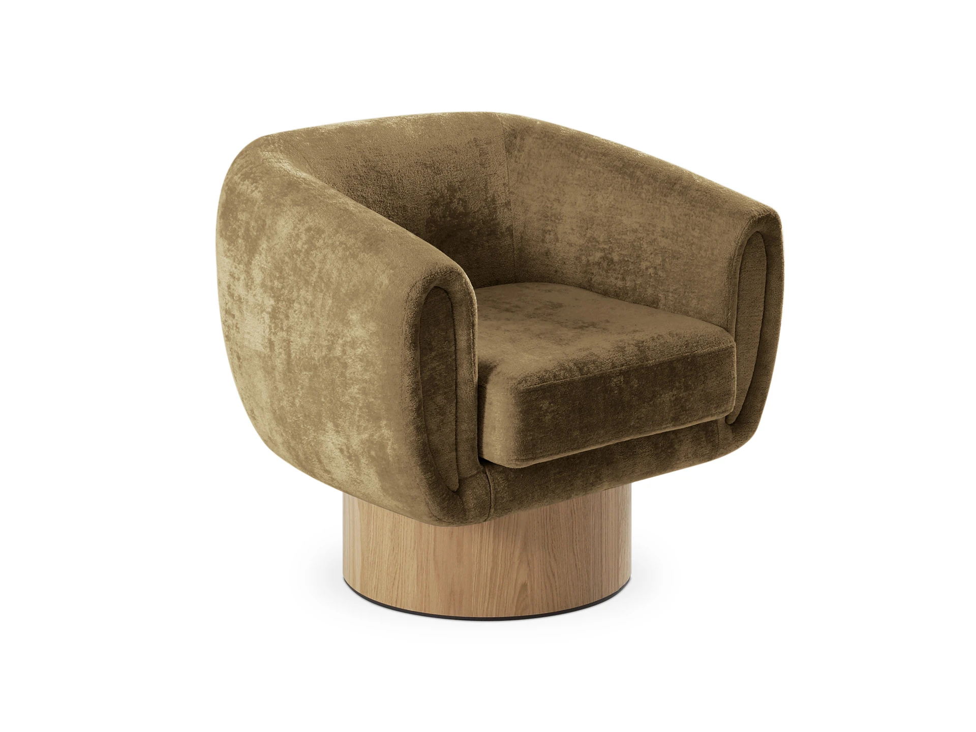 Корпус кресла установлен на основание цилиндрической формы, выполненное в 2-х вариантах: облицовка тканью или шпоном в трех цветах (дуб натуральный, дуб черный, орех).