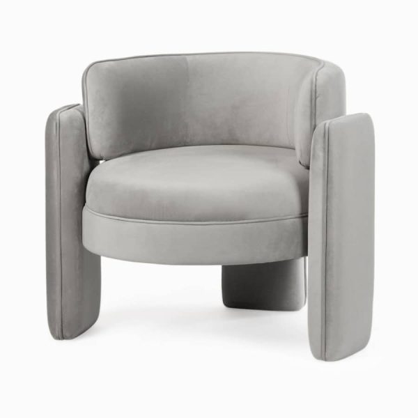 Его округлая форма и отсутствие острых углов создают ощущение мягкости и комфорта. Кресло обито благородным велюром светло-серого цвета, придавая ему элегантный вид. Особенностью модели являются её необычные, подлокотники переходящие в ножки. Вместе со спинкой они создают необычную, но устойчивую конструкцию.