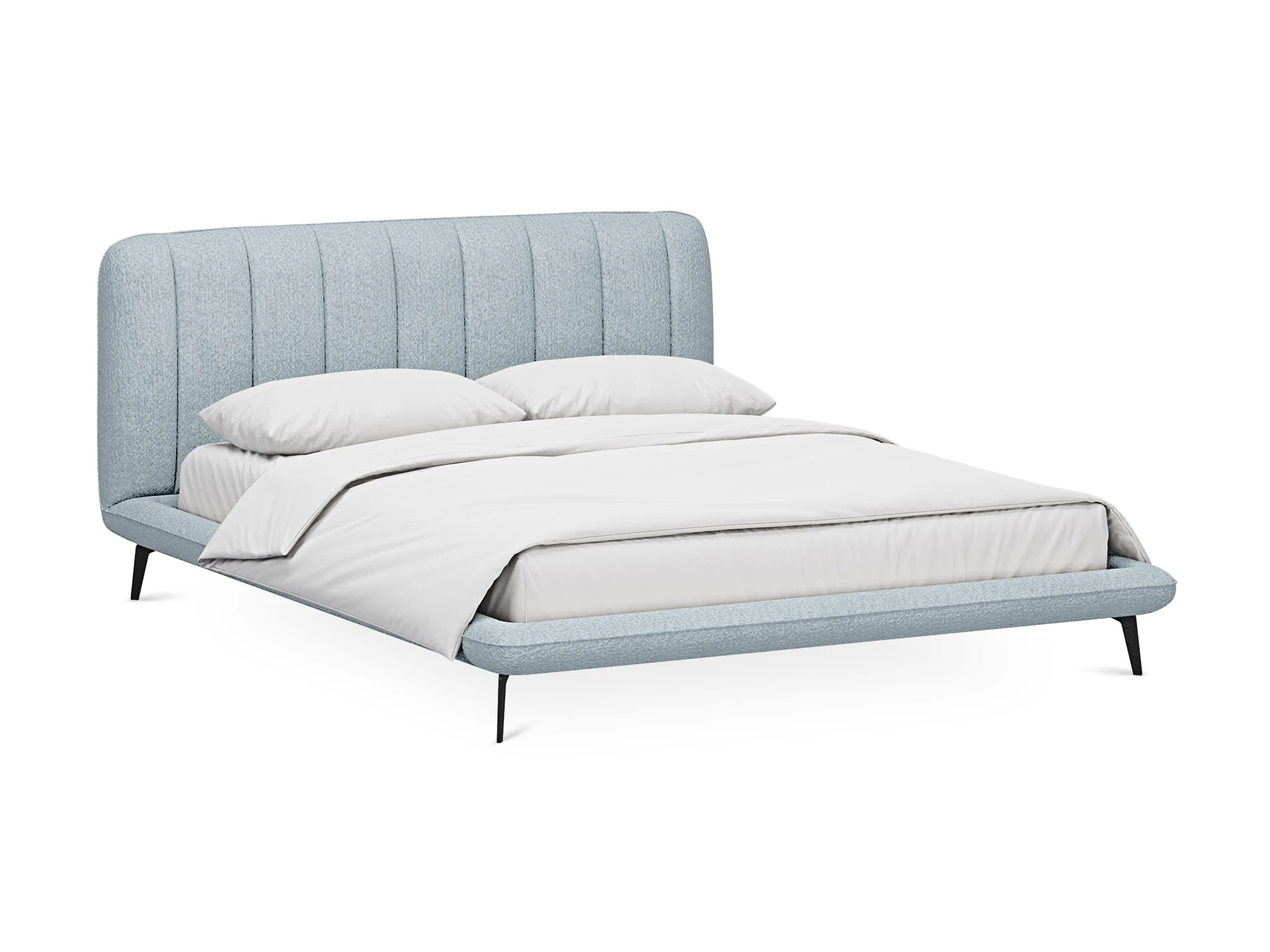 Прочные ножки из металла незаметно приподнимают корпус над полом. Поэтому кровать смотрится воздушно. Также это упрощает уборку. Мягкие изящные царги плавно перетекают в изголовье, единство с которым подчеркивается рельефным кантом.