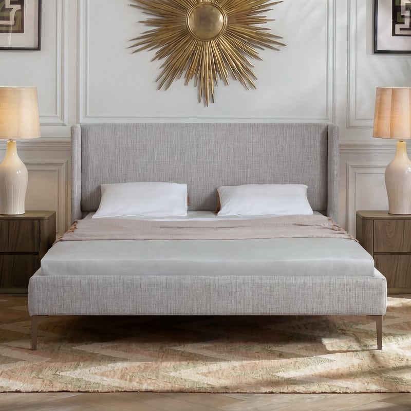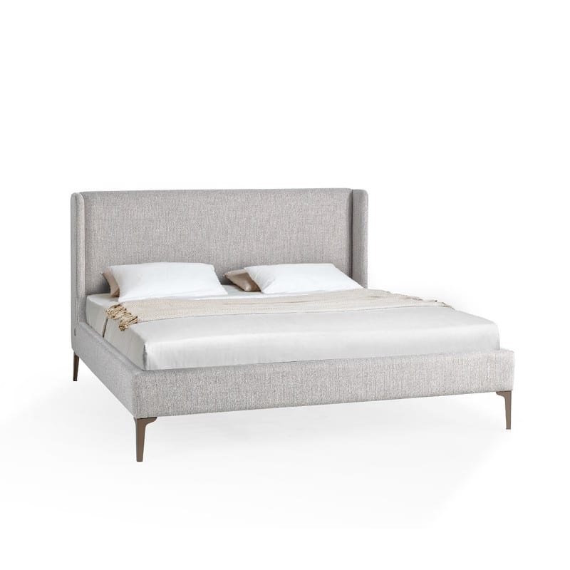 Изголовье и база кровати обиты тканью в бежевых тонах, ножки — матовая нержавеющая сталь.