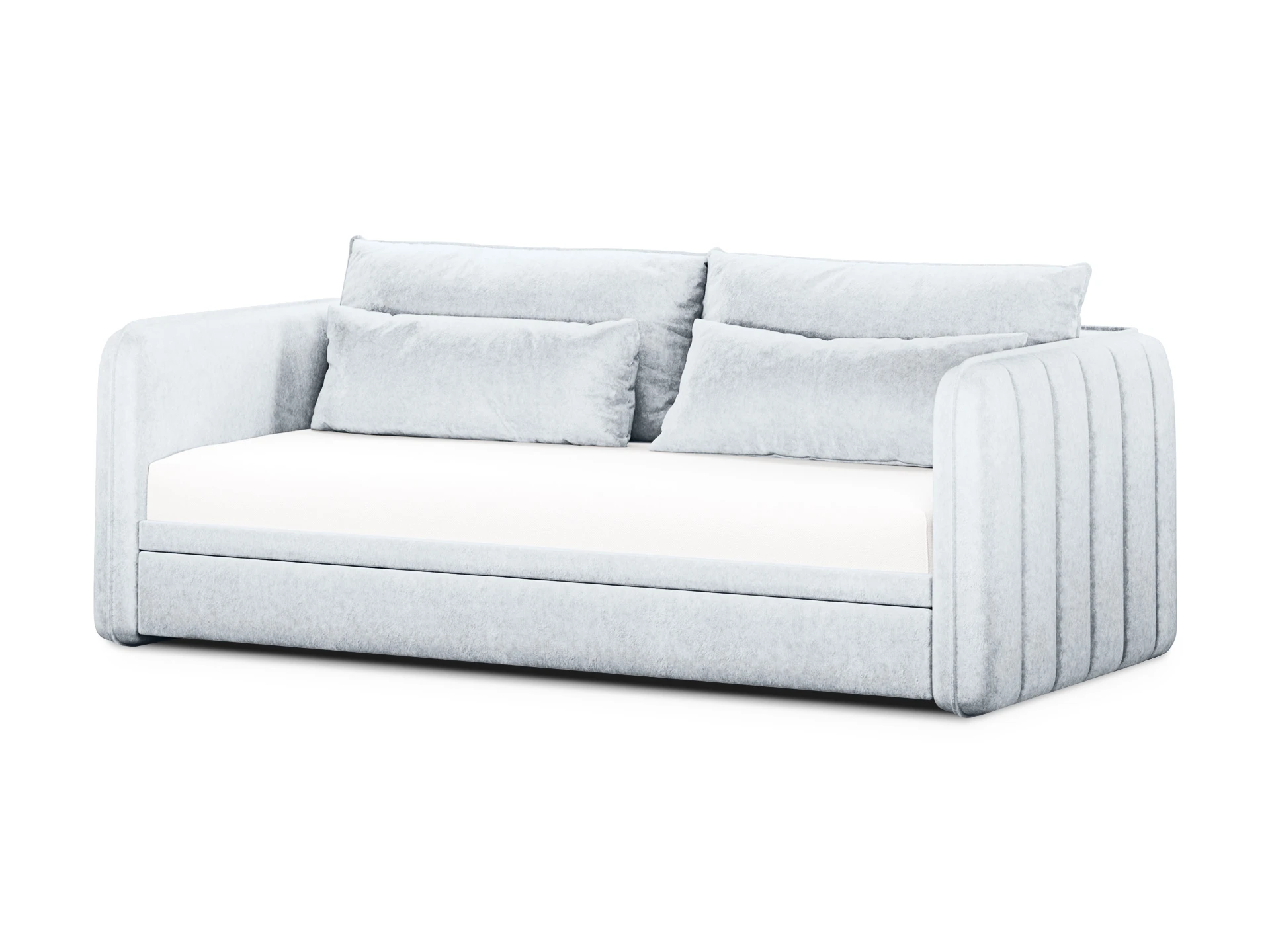 Сиденье имеет комфортную глубину и высоту, спинка оснащена двумя большими подушками из мягкого пенополиуретана, что даёт дополнительную поддержку корпусу и обеспечивает максимально расслабленные ощущения. Подлокотники также укомплектованы прямоугольными подушками из синтепуха, расположение которых можно менять по желанию. Подушки и декоративные вертикальные строчки боковин придают кушетке уютный, объёмный и многослойный вид. Выкатная секция может быть дополнительным спальным местом с нагрузкой до 100 кг. и ящиком для хранения текстиля, сезонных вещей. Можно выбрать цвет и фактуру обивки, которая будет соответствовать вашим индивидуальным предпочтениям. Стилистически нейтральная и практичная кушетка Vicari поможет в реализации разных интерьерных решений и станет элегантным дополнением домашнего пространства.