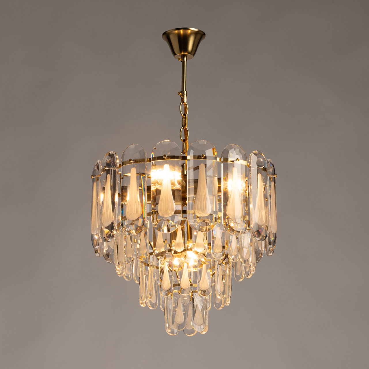Металлическое основание подвесной люстры гальванизировано в цвет латуни. Люстра декорирована хрустальными прозрачными фактурными пластинами сложной огранки.