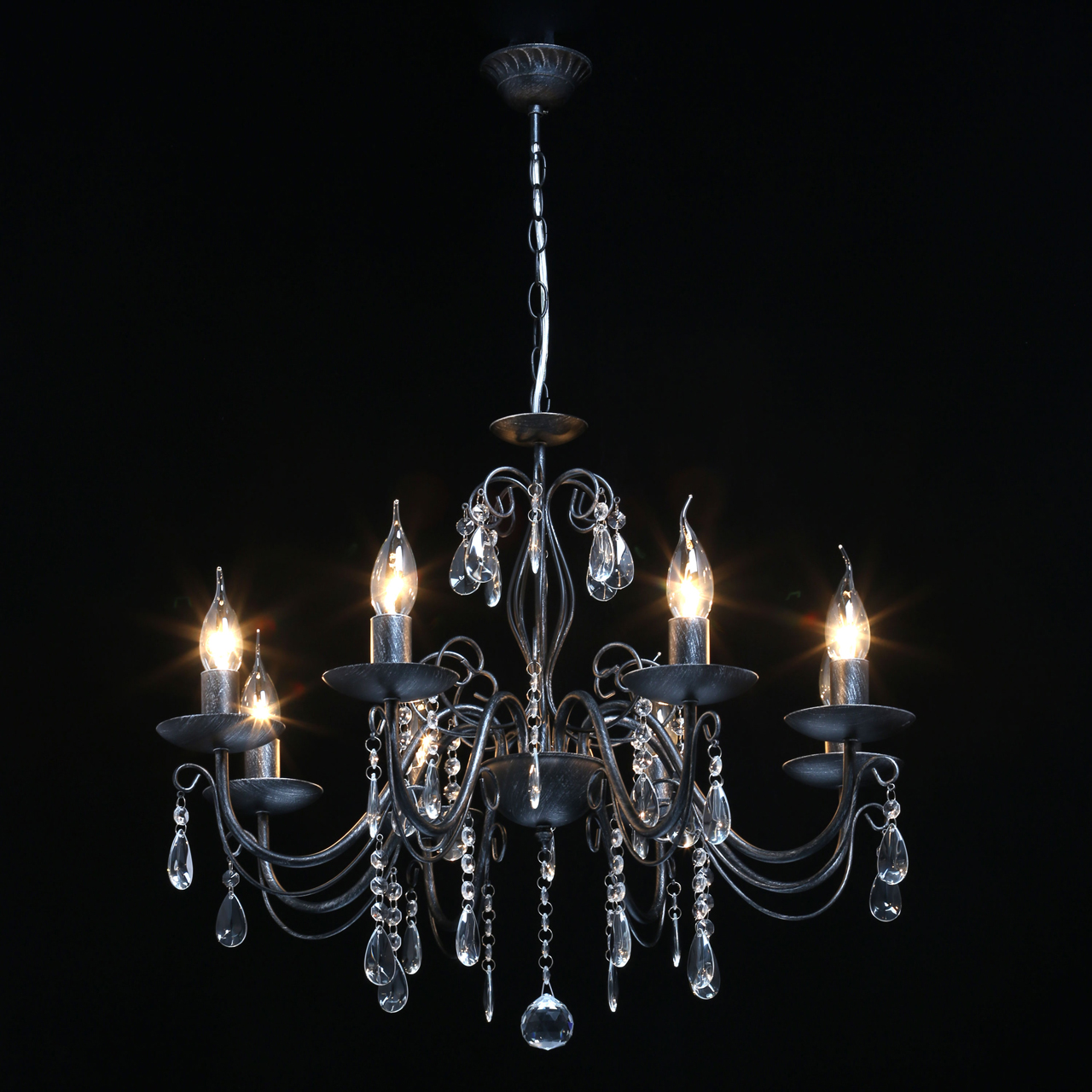 Основание светильника выполнено из металла и обработано по технологии хай-лайт, где основной слой черного цвета, а декоративный слой серебряного цвета. Светильник декорирован прозрачным хрусталем.