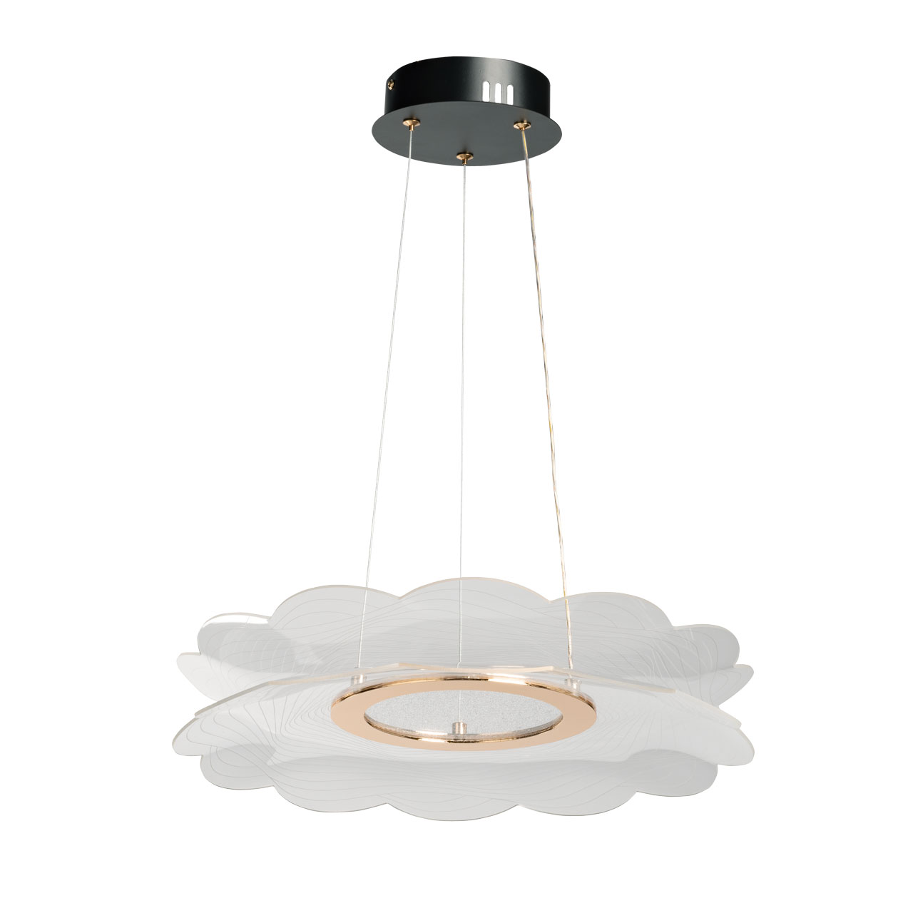 Металлическое основание подвесной люстры окрашено в черный цвет. Корпус плафона выполнен из сплава алюминия и гальванизирован в цвет золота. Люстра декорирована прозрачным акрилом с рисунком оригинальной формы.