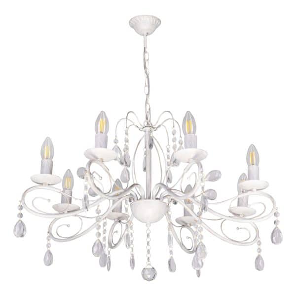 Металлическое основание светильника окрашено в белый цвет и обработано по технологии хай-лайт в золотой цвет. Светильник декорирован стеклянными подвесами миндалевидной формы и хрусталем в форме шара.