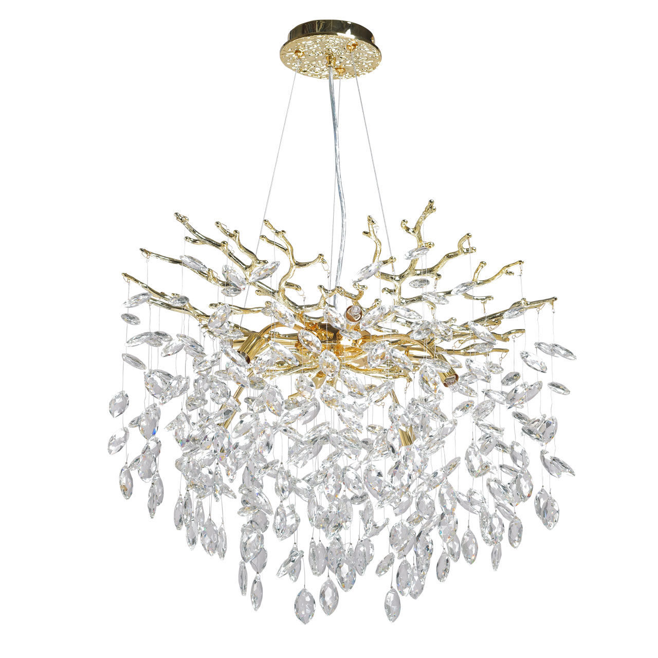 Основание подвесной люстры выполнено по технологии художественного литья из сплава алюминия с цинком и гальванизировано в цвет золота. Люстра декорирована подвесками из прозрачного хрусталя.