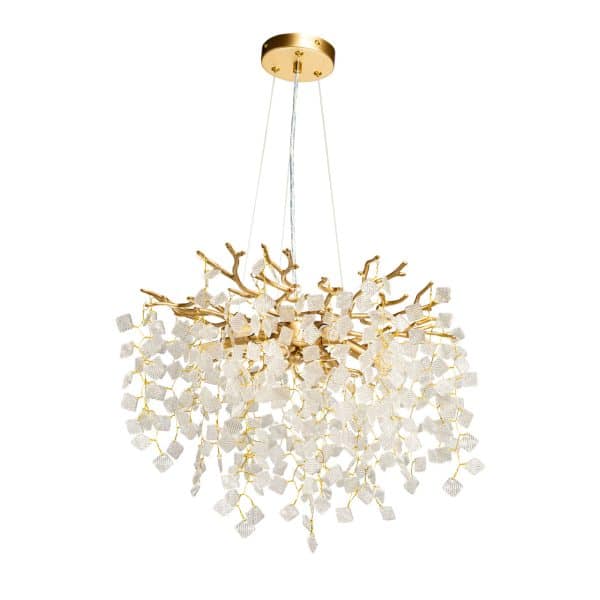 Основание подвесной люстры из сплава алюминия с цинком окрашено в цвет золота. Люстра декорирована прозрачным фактурным стеклом квадратной формы.