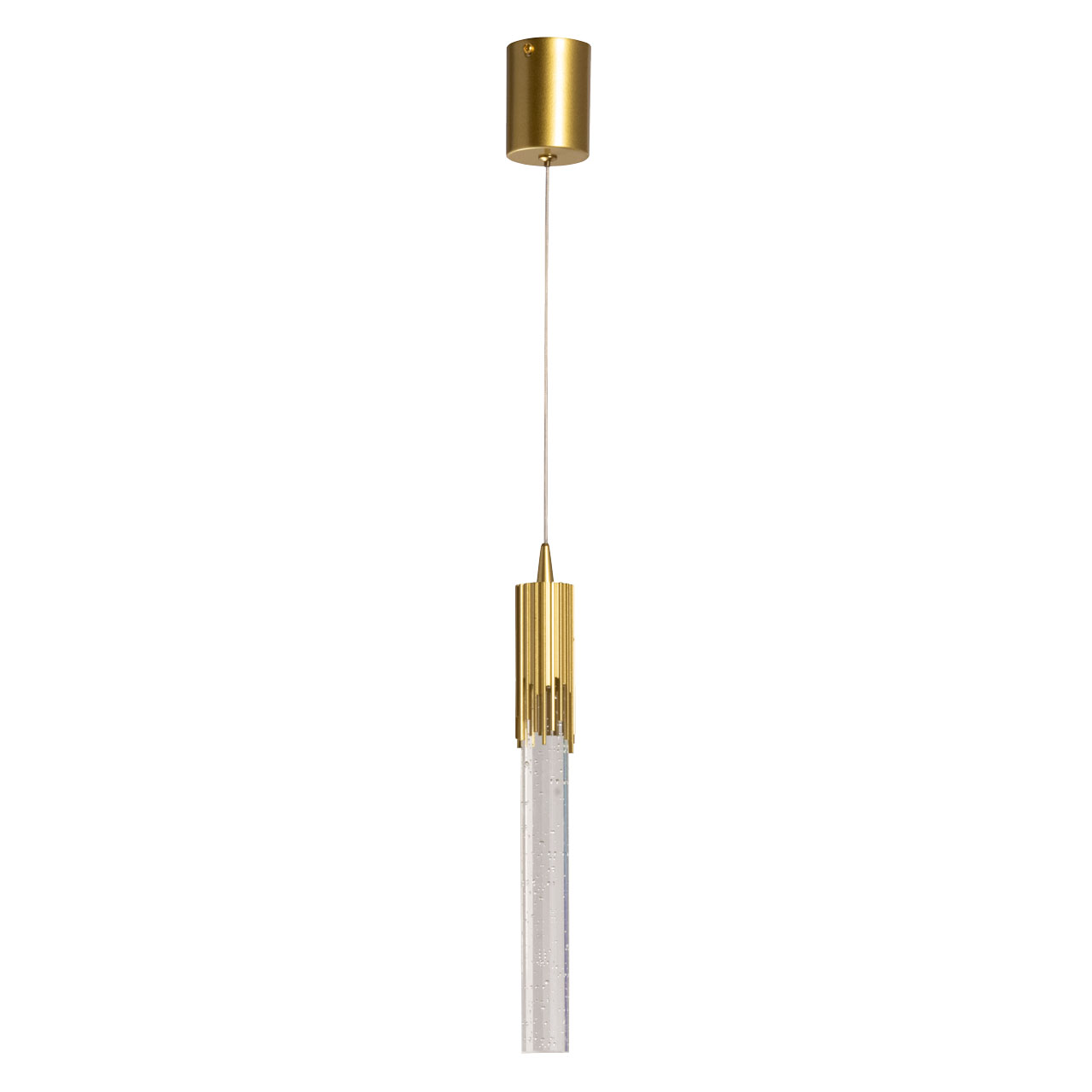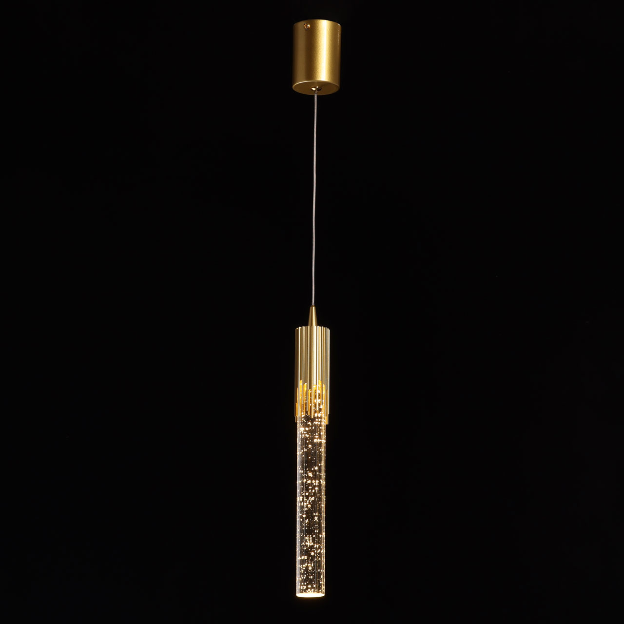 Металлическое основание подвеса гальванизировано в цвет золота и матировано. Корпус плафона выполнен из сплава алюминия и гальванизирован в цвет основания. Светодиодный источник света закрыт прозрачным акрилом с эффектом пузырьков внутри.