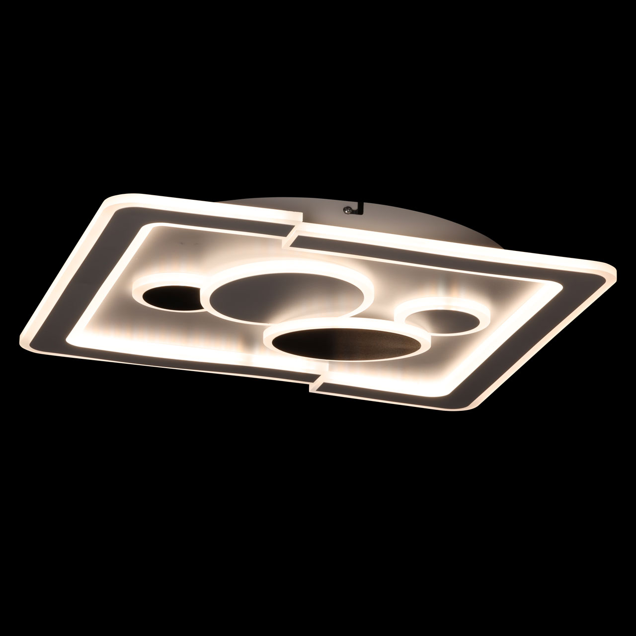 Металлическое основание потолочной люстры окрашено в белый цвет. Корпус плафонов выполнен из сплава алюминия с цинком и окрашен в белый и черный цвета. Светодиодные источники света закрыты матовым акрилом.