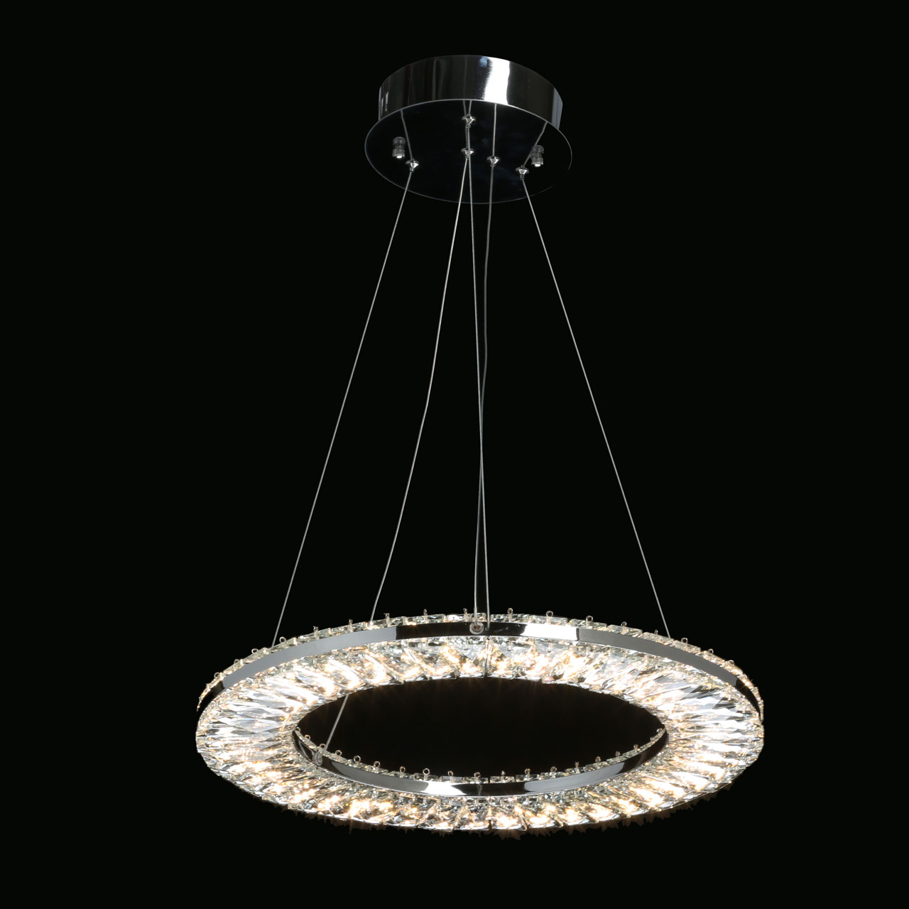 Металлическое основание светильника гальванизировано в цвет хрома. Потолочная чаша подвесной люстры закрыта листом нержавеющей стали, отполированной до зеркального блеска. Светильник декорирован прозрачным хрусталем прямоугольной формы со сложной огранкой.