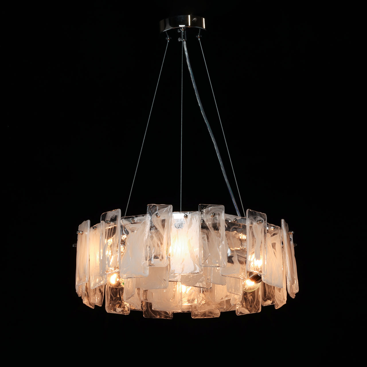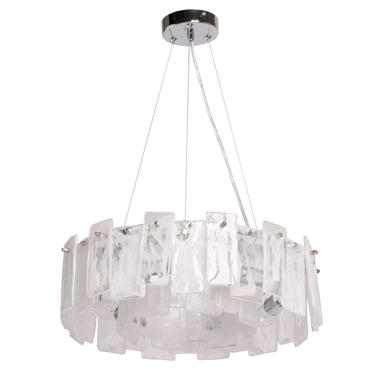 Металлическое основание люстры гальванизировано в цвет хрома. Плафон выполнен из пластин из стекла, иммитирующего природные минералы прямоугольной формы.