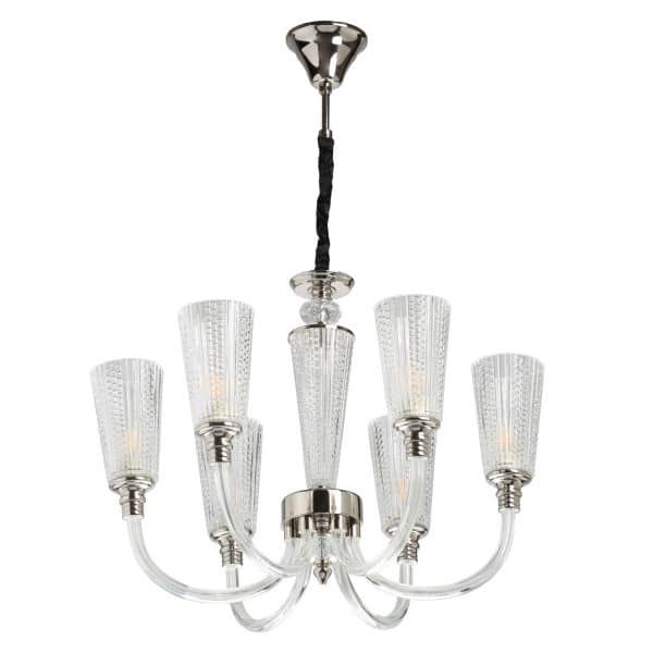 Металлическое основание гальванизировано в цвет хрома. Рожки выдуваются вручную из гутного стекла. Светильник декорирован плафонами из фактурного прозрачного стекла. Центральная ось декорирована массивами хрусталя.