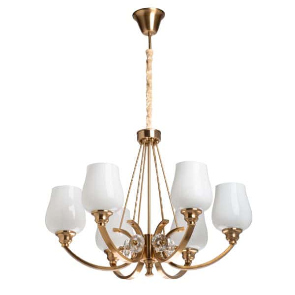 Основание выполнено из комбинации сплавов металлов и гальванизировано в цвет латуни. Рожки выполнены из сплава алюминия по технологии художественного литья, декоративные подвесы выполнены из металла по технологии твист. Стеклянные плафоны выдуваются в форму вручную и окрашены в белый цвет изнутри. Корпус светильника декорирован стеклянными розетками, отлитыми в сложную форму.