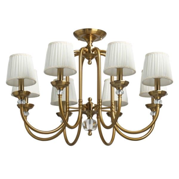 Металлическое основание потолочной люстры гальванизировано в цвет медовой бронзы. Источники света закрыты белыми текстильными абажурами. Люстра декорирована массивами хрусталя.