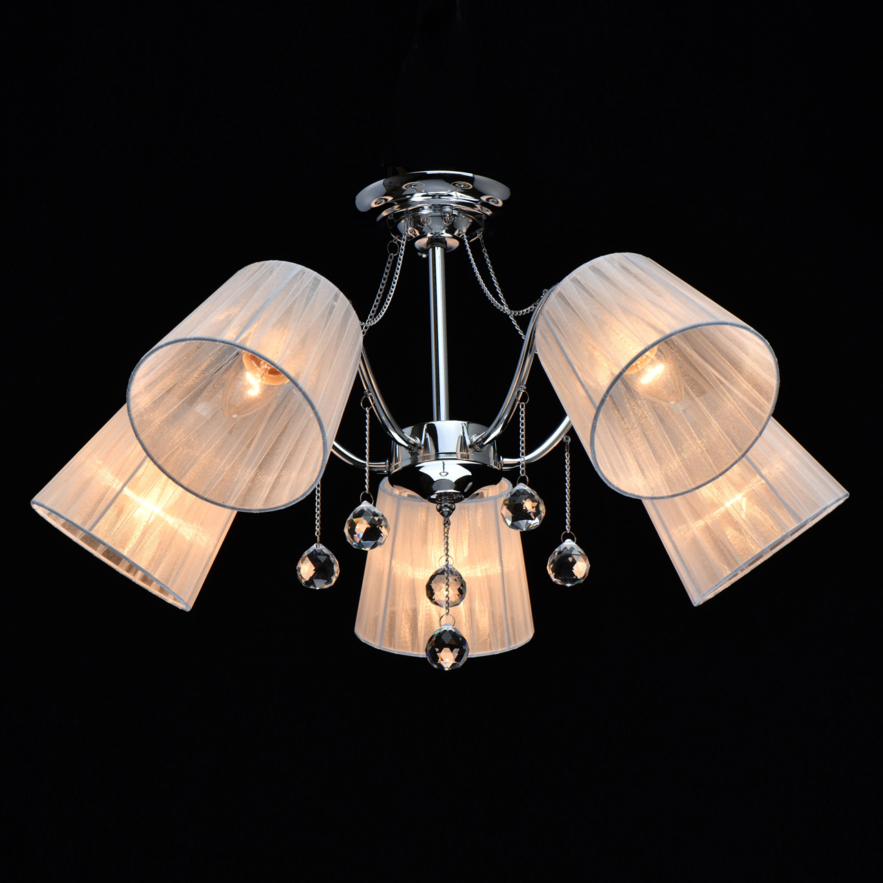 Основание светильника выполнено из сплава металла и гальванизировано в цвет хрома. Абажуры из прозрачной органзы белого цвета с термостойким акрилом внутри. Абажуры отделаны кантом сверху и снизу, прошиты. Светильник декорирован металлическими цепочками в цвет основания и прозрачным хрусталем в форме шара.