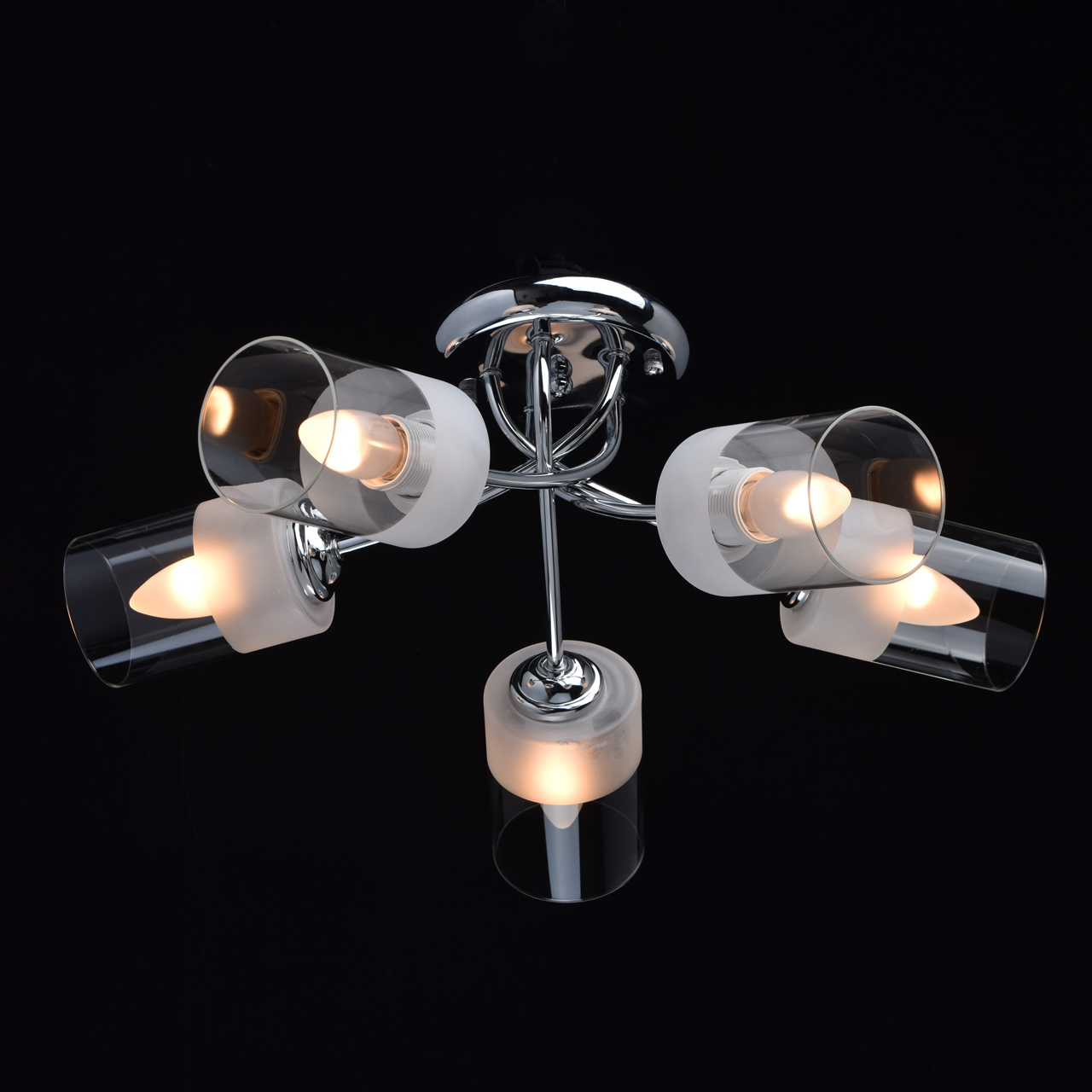 Основание светильника выполнено из металла и гальванизировано в цвет хрома. Стеклянные плафоны отлиты в форму и наполовину матированы .