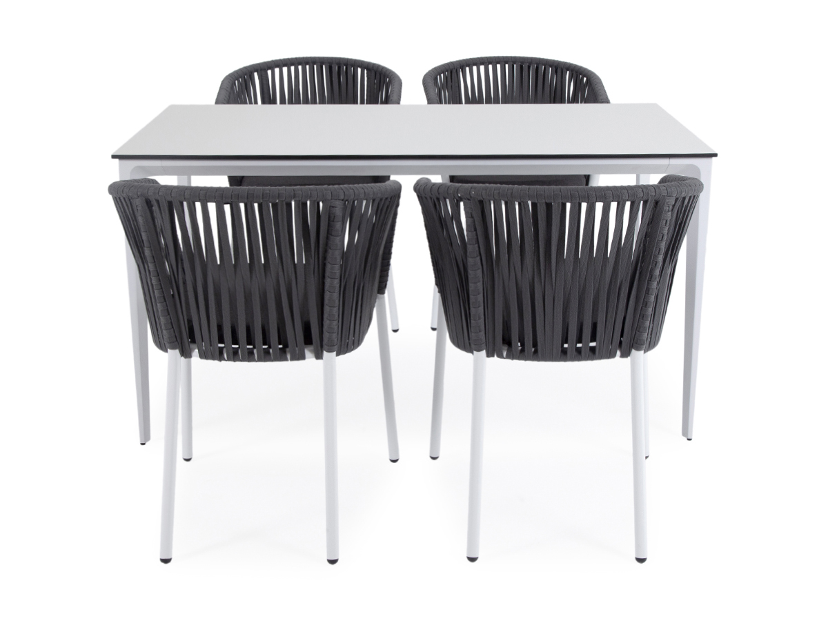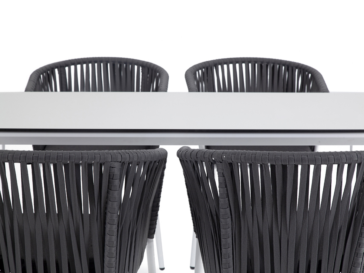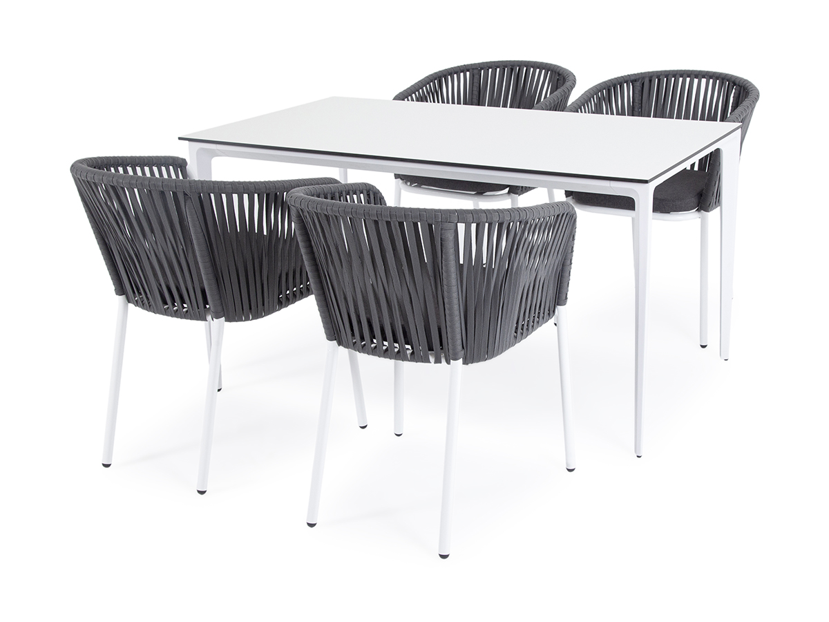 — 4 плетеных стула «Бордо» из плоского роупа, размером — 570×620×775 мм, цвет роупа — серый, каркас — белый. «Малага» обеденный стол из HPL 140х80см, цвет молочный, каркас белый 1шт. 1 400Х800Х750, «Бордо» стул плетеный из роупа, каркас алюминий белый шагрень, роуп серый 15мм, ткань серая 4шт. 570Х620Х775,
