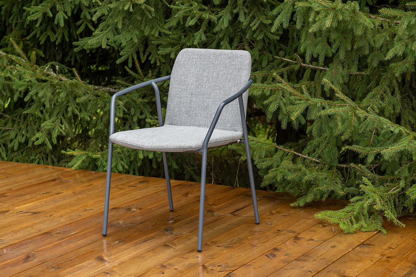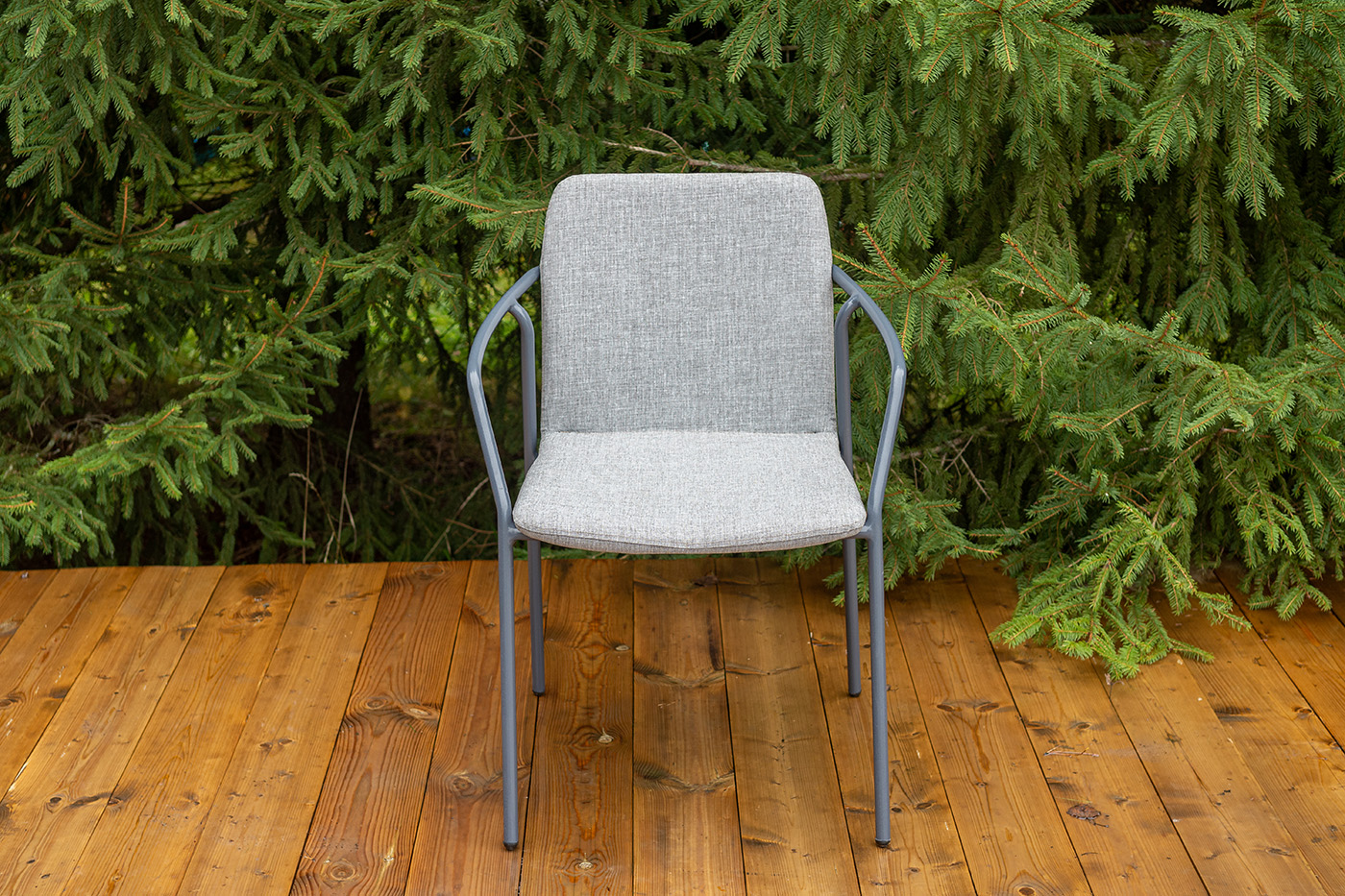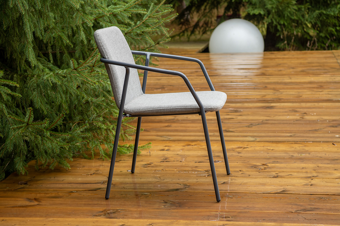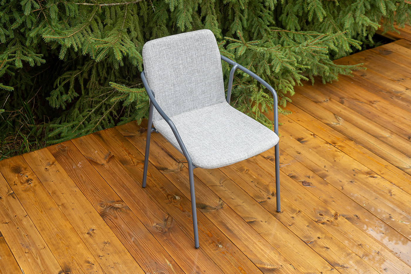 Стул «Марокко» изготовлен из современного материала — текстилена Nanotex. Каркас выполнен из алюминия, окрашенного в темно‑серый цвет (RAL 7024), что обеспечивает прочность и лёгкость конструкции. Размеры стула — 575×600×800 мм. Модель отличается износостойкостью, устойчивостью к влаге и ультрафиолету, проста в уходе и подходит для использования на террасе, веранде, в кафе или загородном доме.