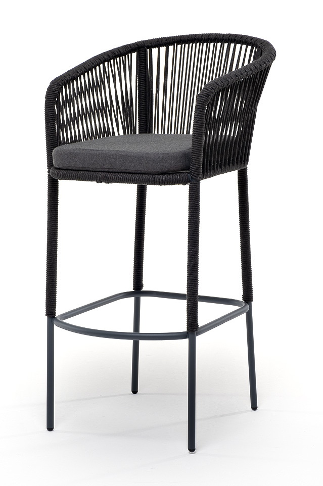 «Марсель» стул барный плетеный из роупа, каркас из стали серый (RAL7022) муар, роуп темно-серый круглый, ткань темно-серая 027