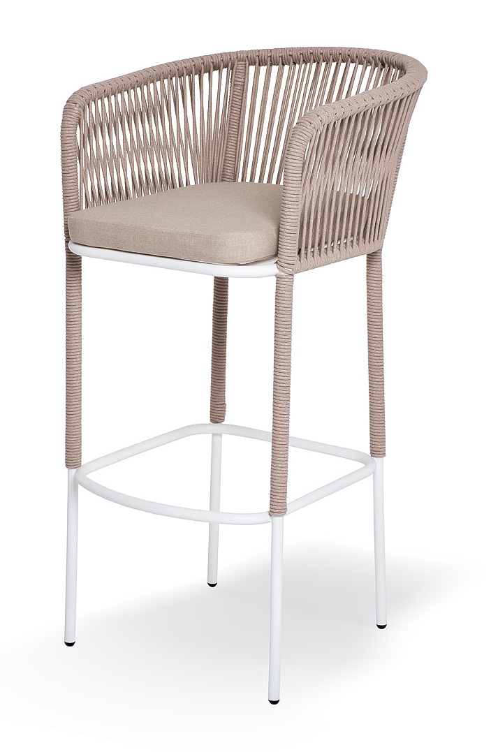 «Марсель» стул барный плетеный из роупа, каркас из стали светло-серый (RAL7035) муар, роуп бежевый круглый, ткань Mossle бежевая, пос.H65