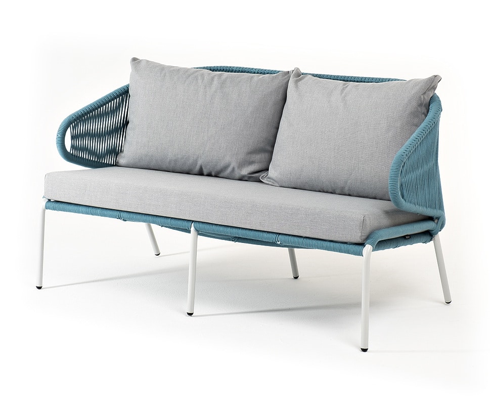 «Милан» диван 2-местный плетеный из роупа, каркас алюминий светло-серый (RAL7035) муар, роуп бирюзовый круглый, ткань светло-серая