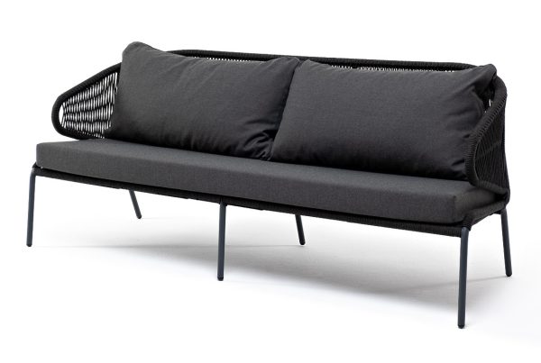 «Милан» диван 3-местный плетеный из роупа, каркас алюминий темно-серый (RAL7024) муар, роуп темно-серый круглый, ткань темно-серая 027