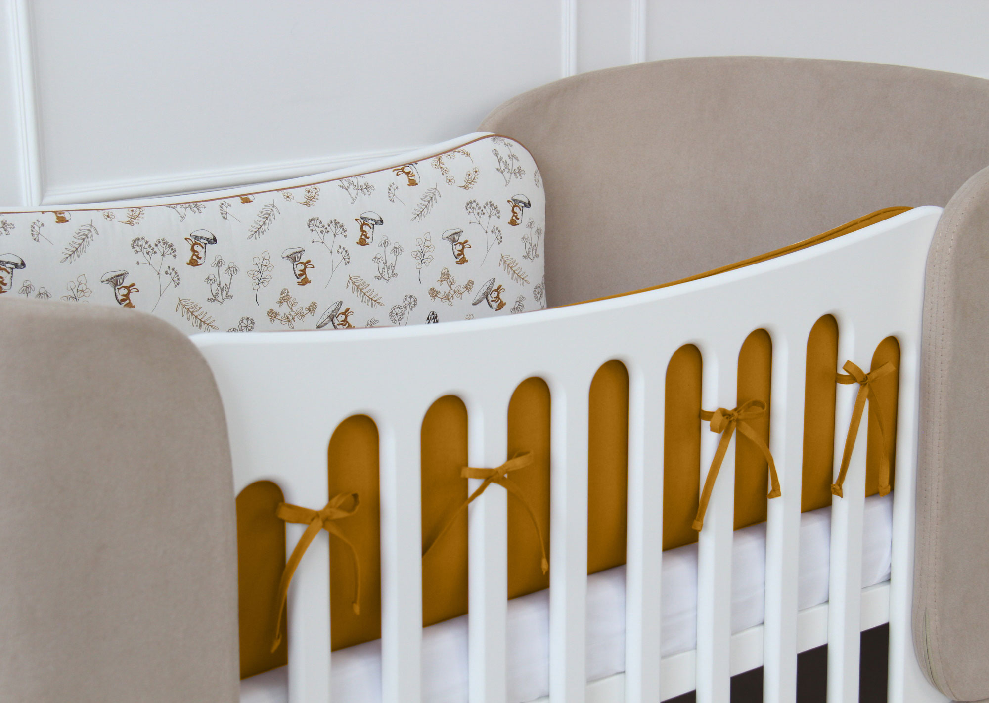 Мягкие бортики для кроватки KIDI soft «Зайчики с грибами» (горчичный, сатин)