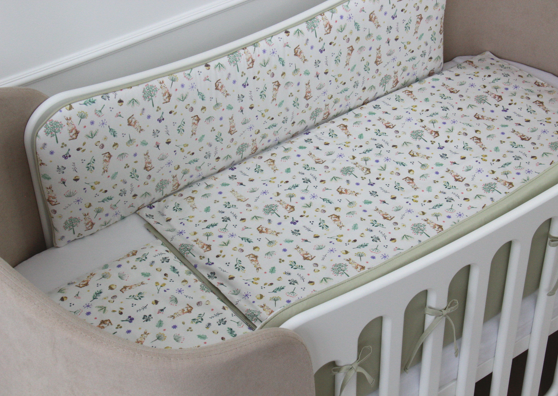 Мягкие бортики для кроватки KIDI soft «Зайчики с желудями» (фисташковый, сатин)