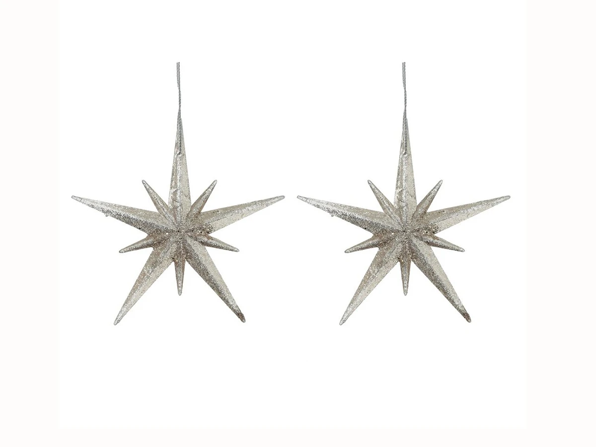 Новогоднее украшение Звезда» будет чудесно сверкать в лучах гирлянд и создавать волшебное настроение, даря настоящую новогоднюю атмосферу. Подойдет для декорации Вашего дома и новогодней ели. В наборе: 2 шт.»