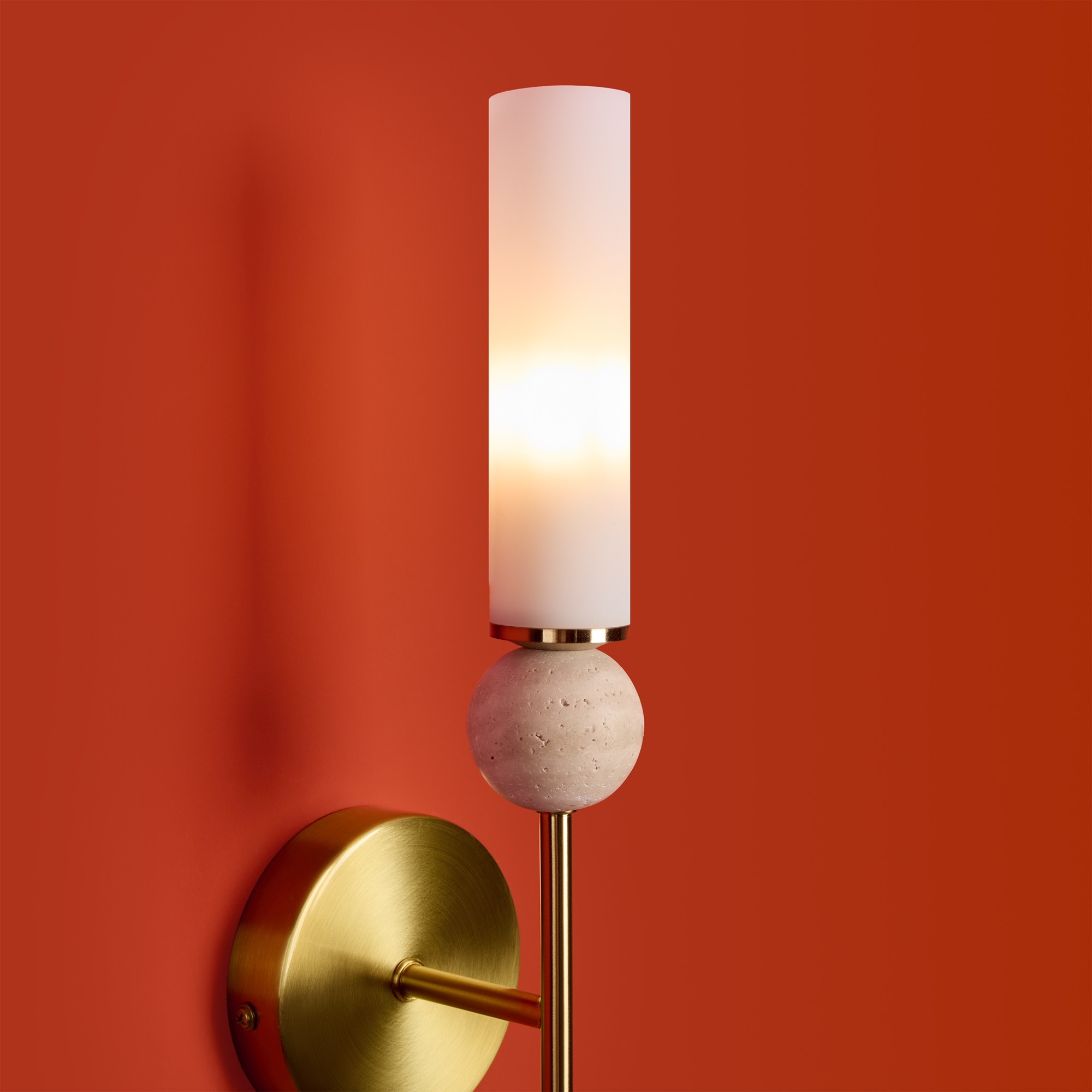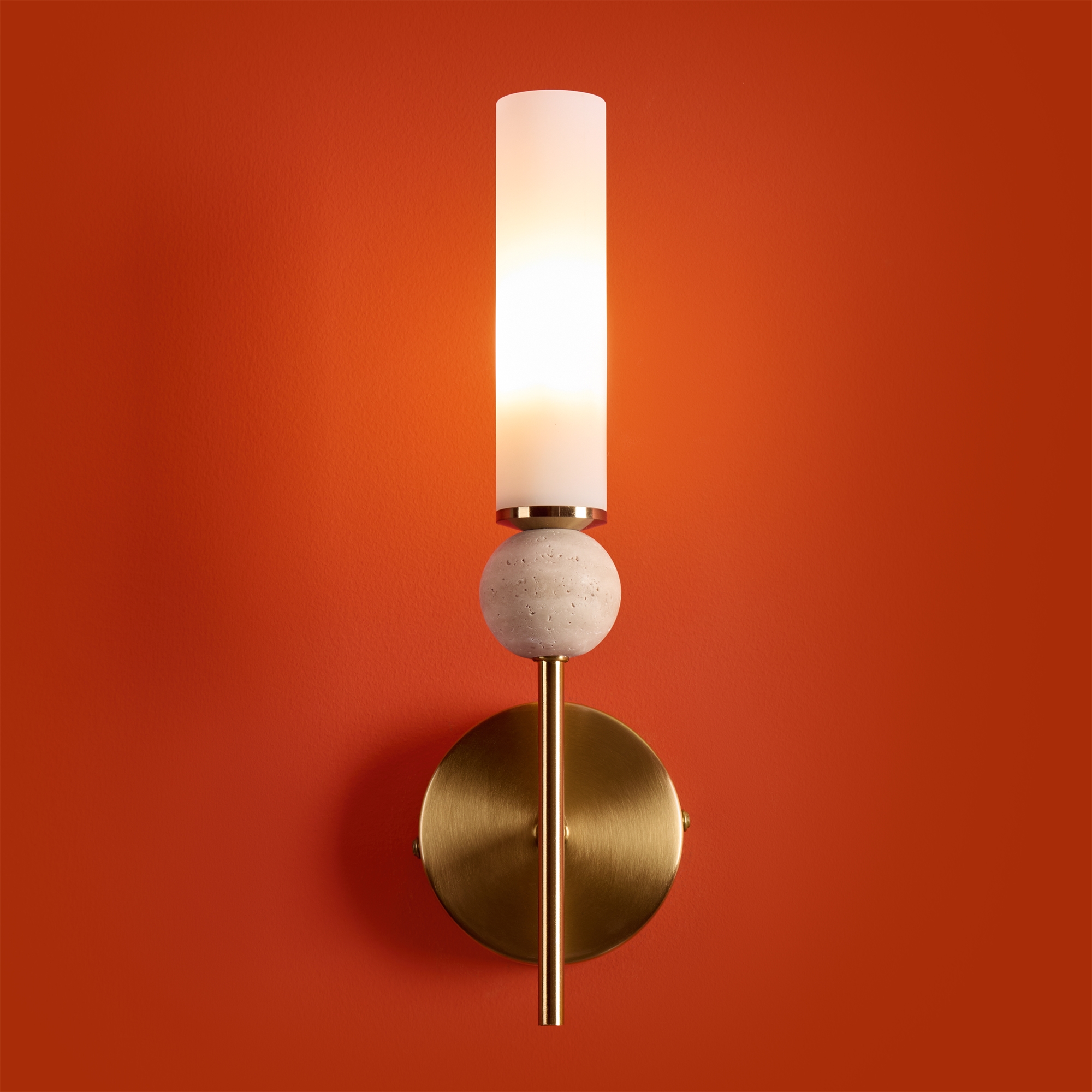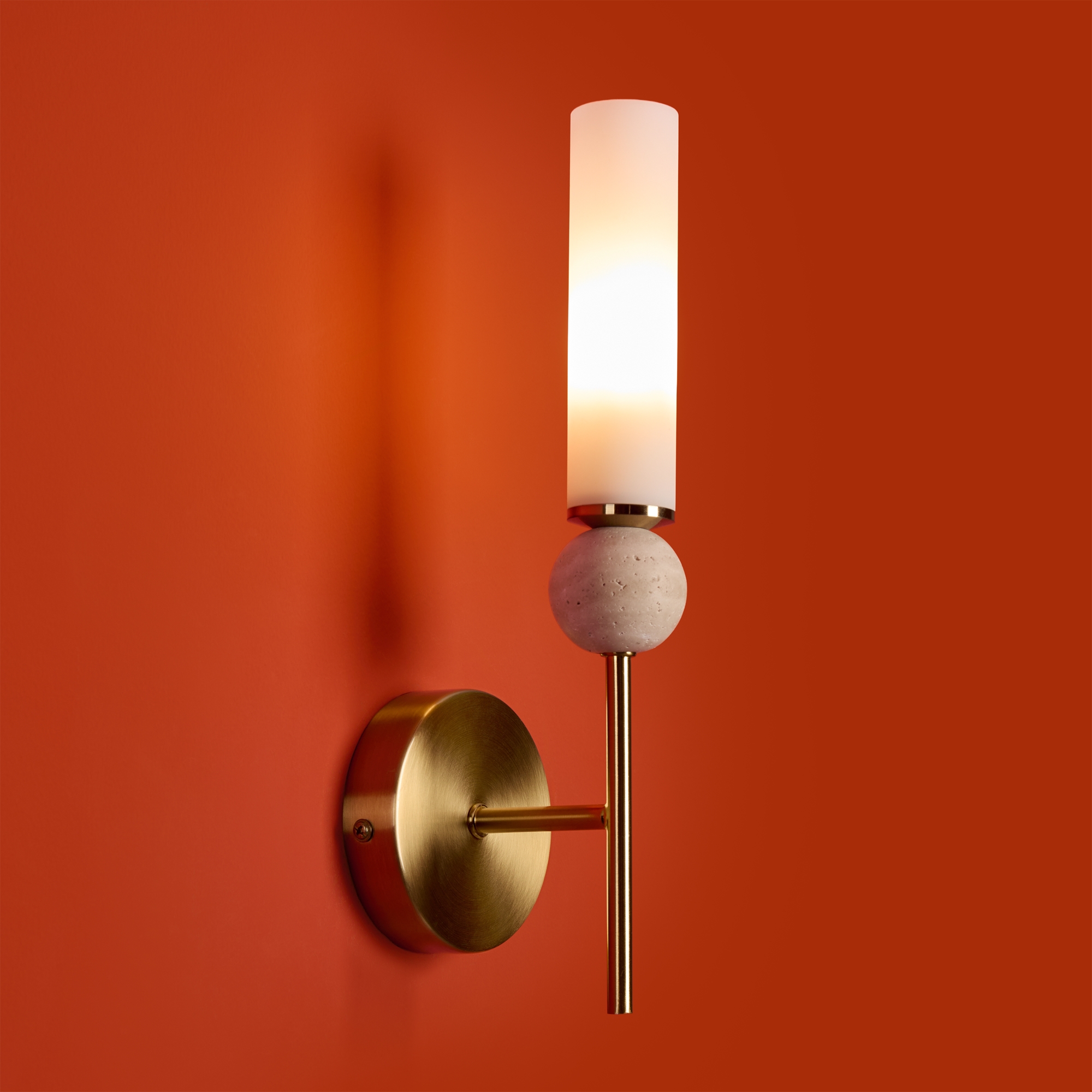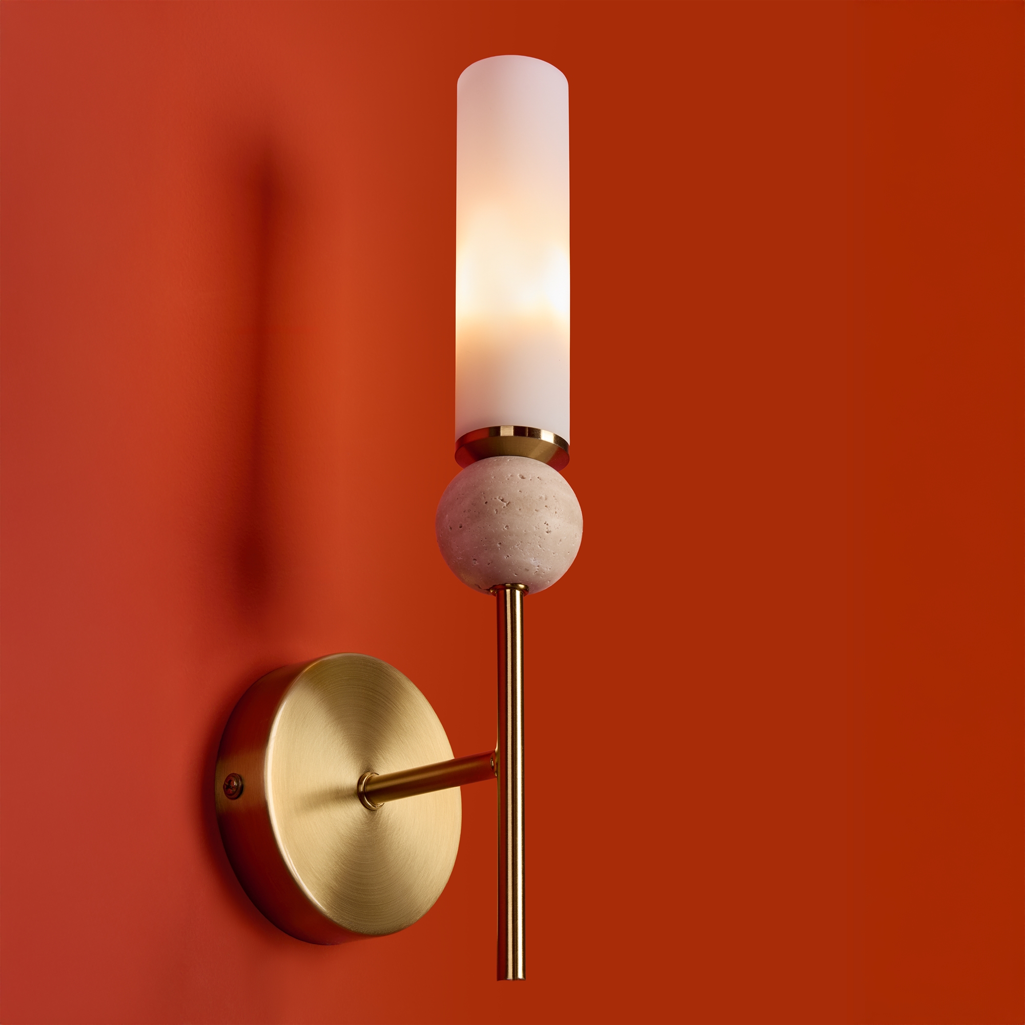 Натуральный травертин и стеклянные плафоны. Металл (латунь, черный). Матовые белые абажуры. LED 3000K (E14/G9, не в комплекте). Сенсорное управление. Подвесные светильники с декоративным элментом травертина в виде шара.