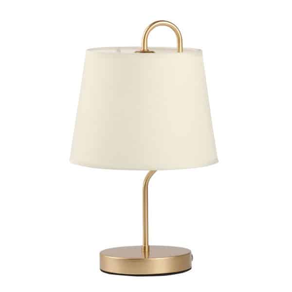 Металлическое основание настольной лампы окрашено в цвет перламутрового золота. Заменяемый источник света закрыт текстильным абажуром бежевого цвета. С внутренней стороны текстиль защищен прозрачным термостойким акрилом. Абажур отделан кантами и прошит.