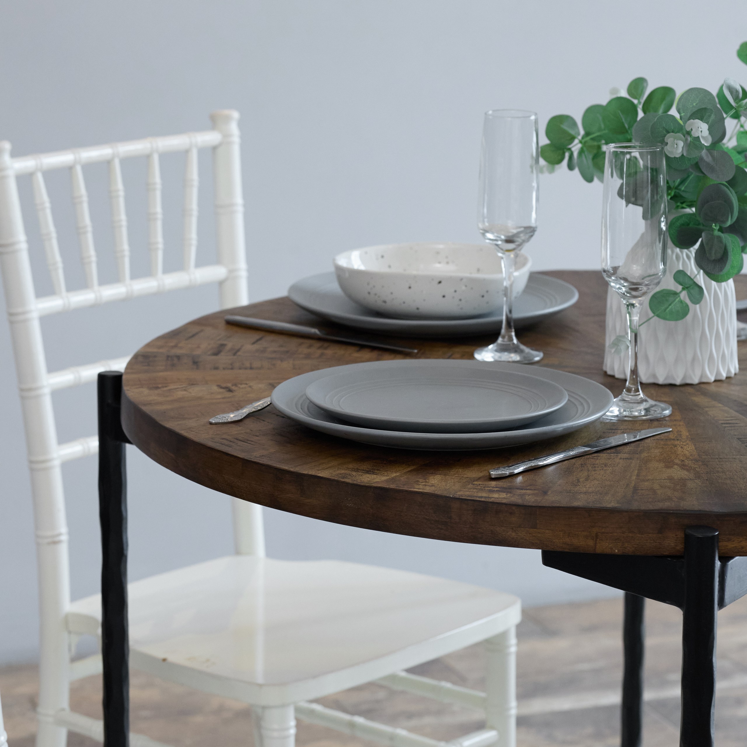 • Поверхность столешницы не идеально гладкая, а намеренно живая. Естественный волнообразный рельеф массива манго сохранён и подчёркнут — декоративные гребни с перепадом до 3 мм не влияют на устойчивость посуды и не создают неудобств в ежедневном использовании. Это тактильная особенность, которая напоминает: перед вами не имитация, а настоящий массив. Чтобы визуально сгладить рельеф или добавить сервировке завершённости, достаточно использовать текстиль: салфетки, подставки или столовую дорожку.