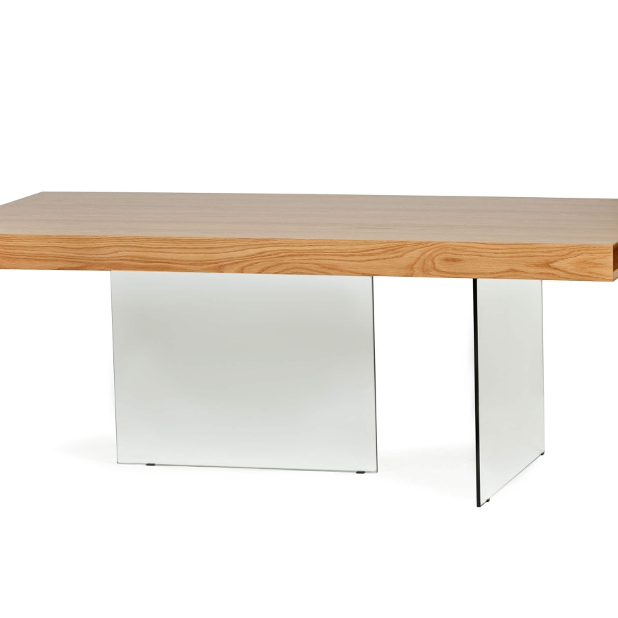 Столешница из дубового шпона в оттенке демонстрирует естественную красоту дерева, привнося тепло и органическую текстуру в ваше обеденное пространство. Что отличает этот стол, так это его эффектное основание, изготовленное из закаленного стекла ножек прозрачного цвета.