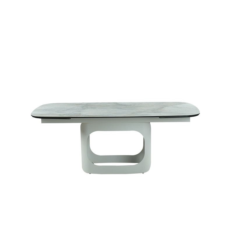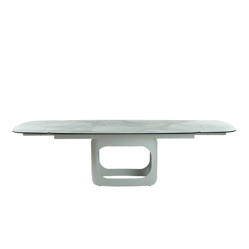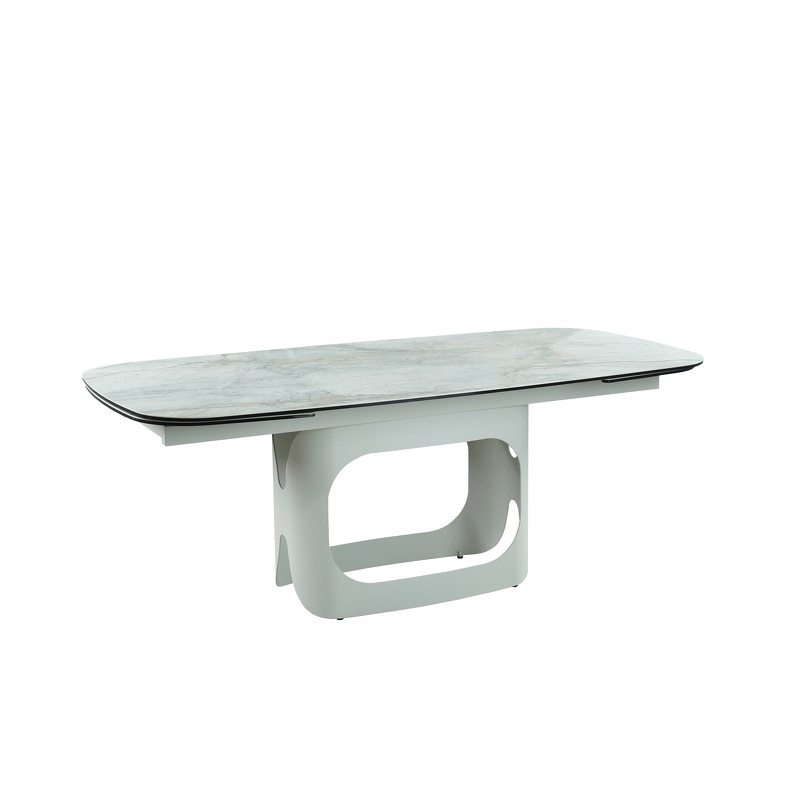 Магия дизайна заключена в многослойной столешнице из стеклокерамики: 10 мм закаленного стекла и 3 мм керамики создают эффект глубины, объема и чистого, холодного блеска. Это основание из прочного металла со светло-бежевым порошковым покрытием придает всей конструкции невесомую элегантность и служит идеальным нейтральным фоном для смелых интерьерных решений.