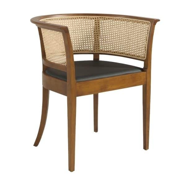 Деревянный стул орехового цвета. Сиденье обито черной экокожей, а спинка – ротанговой сеткой.