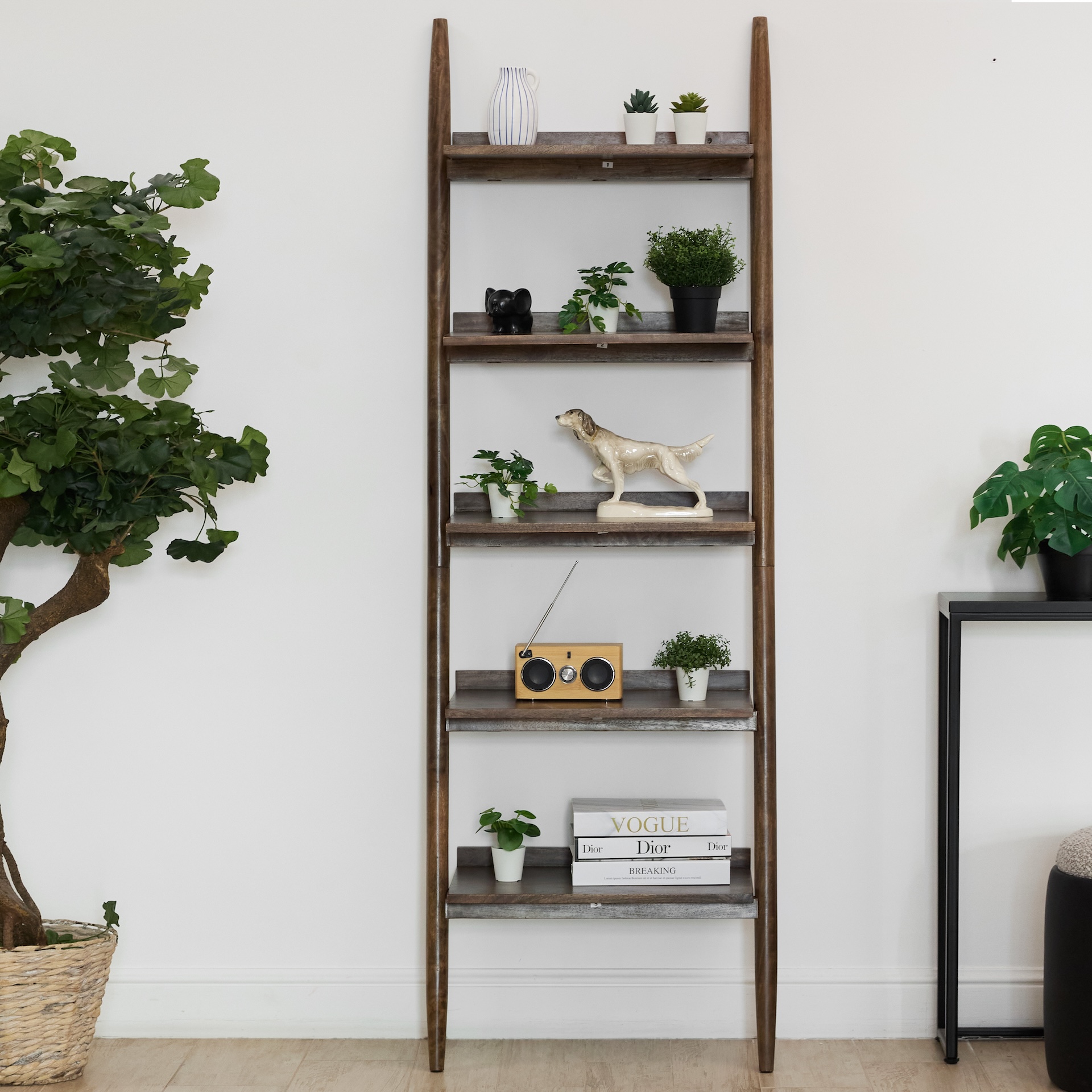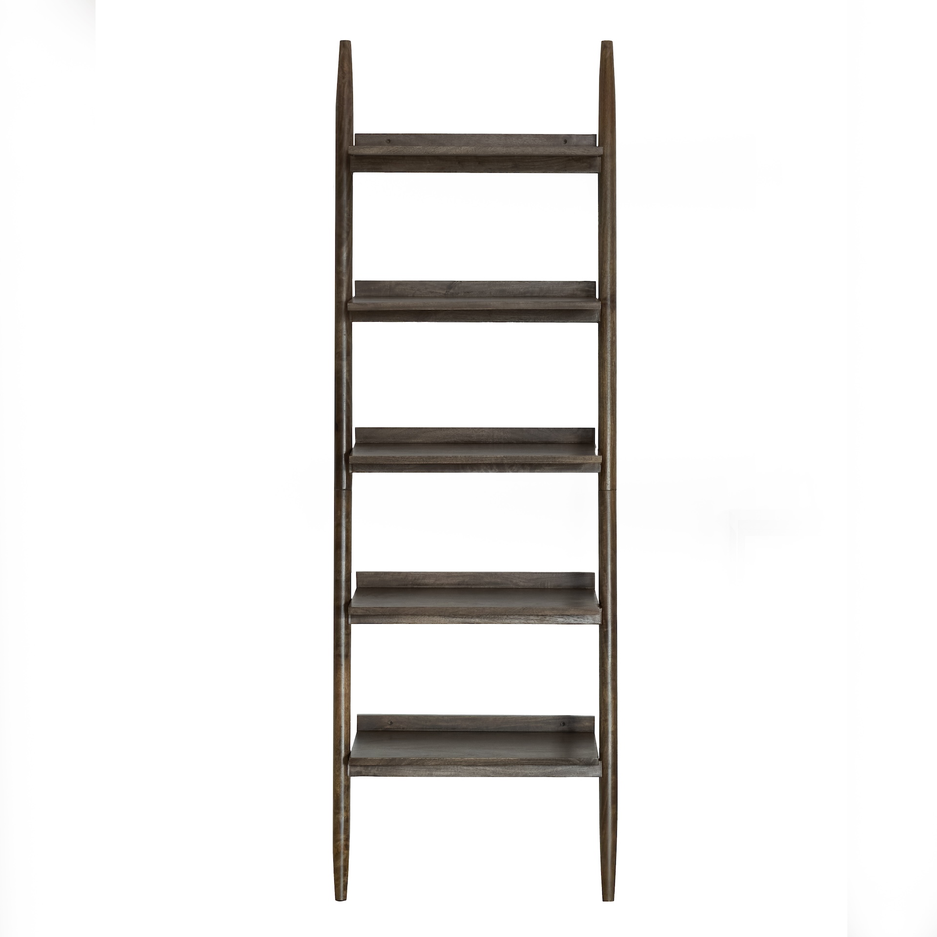 Стеллаж с пятью полками, где функциональный дизайн создаёт выразительный ритм вертикальных линий. Конусообразные ножки и направляющие придают конструкции лёгкую динамику, а насыщенный коричневый цвет подчеркивает глубину и благородство массива манго.