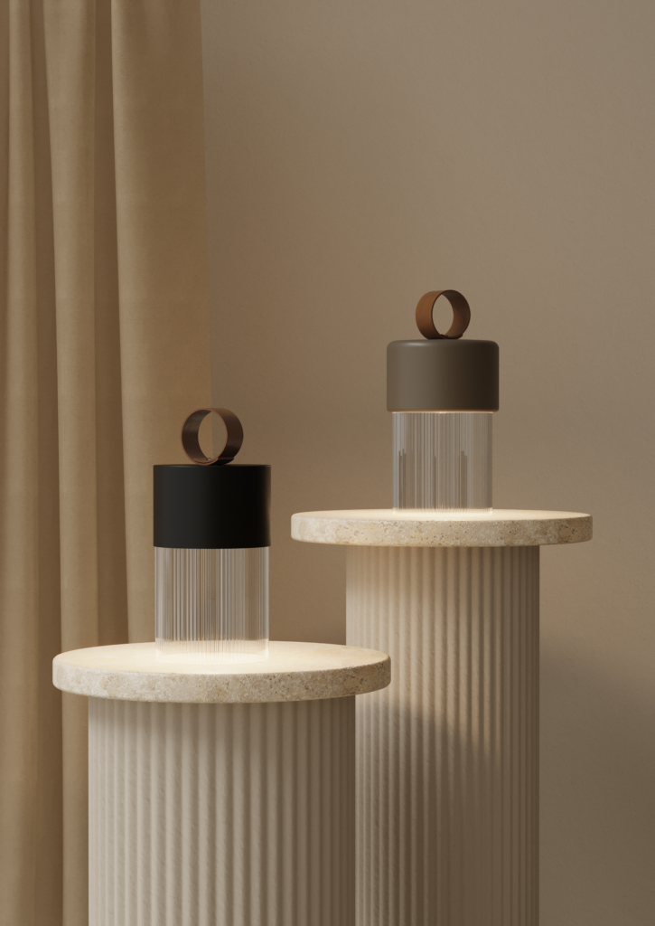 Переносная настольная лампа, выполненная из стекла с крышкой из керамики или стали в черной или золотой отделке. С ручкой из синтетической кожи.